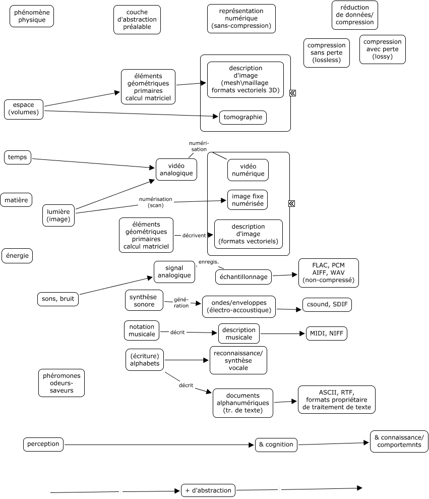 Cette carte de concepts créée avec IHMC CmapTools traite de: 3840_total, temps vidéo analogique, + d'abstraction, ondes/enveloppes (électro-accoustique) csound, SDIF, espace (volumes) éléments géométriques primaires calcul matriciel, signal analogique enregis. échantillonnage, lumière (image) vidéo analogique, sons, bruit signal analogique, notation musicale décrit description musicale, & cognition & connaissance/ comportemnts, lumière (image) numérisation (scan) image fixe numérisée, perception & cognition, synthèse sonore géné- ration ondes/enveloppes (électro-accoustique), vidéo analogique numéri- sation vidéo numérique, description musicale MIDI, NIFF, éléments géométriques primaires calcul matriciel description d'image (mesh\maillage formats vectoriels 3D), (écriture) alphabets reconnaissance/ synthèse vocale, espace (volumes) tomographie, échantillonnage FLAC, PCM AIFF, WAV (non-compressé), (écriture) alphabets décrit documents alphanumériques (tr. de texte), documents alphanumériques (tr. de texte) ASCII, RTF, formats propriétaire de traitement de texte