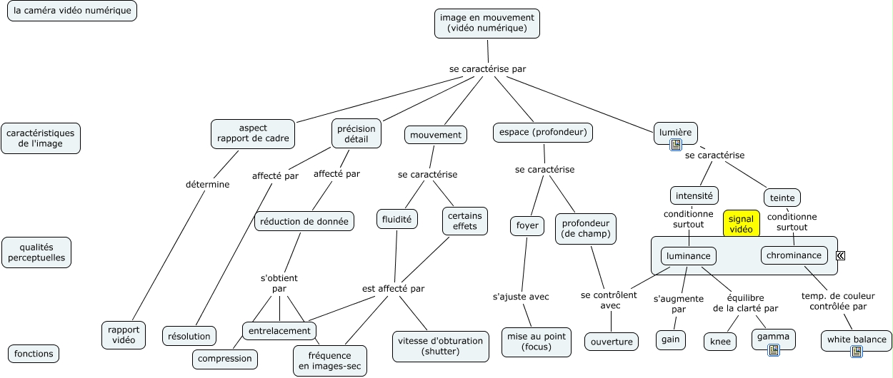 Cette carte de concepts créée avec IHMC CmapTools traite de: video_nx5U, précision détail affecté par résolution, luminance équilibre de la clarté par knee, luminance se contrôlent avec ouverture, image en mouvement (vidéo numérique) se caractérise par mouvement, fluidité est affecté par fréquence en images-sec, lumière se caractérise teinte, teinte conditionne surtout chrominance, image en mouvement (vidéo numérique) se caractérise par lumière, réduction de donnée s'obtient par entrelacement, réduction de donnée s'obtient par compression, aspect rapport de cadre détermine rapport vidéo, chrominance temp. de couleur contrôlée par white balance, luminance s'augmente par gain, intensité conditionne surtout luminance, fluidité est affecté par vitesse d'obturation (shutter), certains effets est affecté par vitesse d'obturation (shutter), luminance équilibre de la clarté par gamma, certains effets est affecté par fréquence en images-sec, lumière se caractérise intensité, espace (profondeur) se caractérise foyer