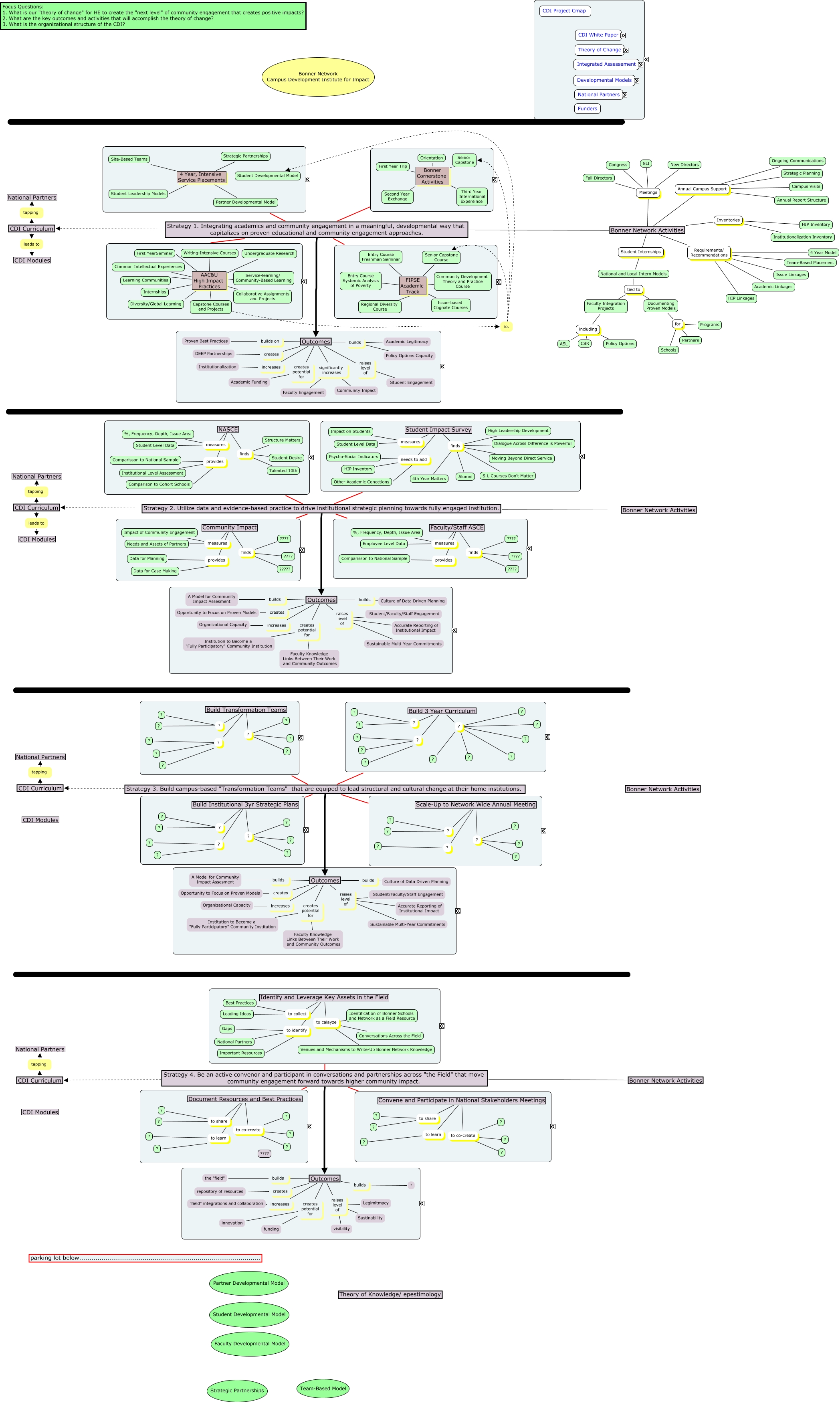 This Concept Map, created with IHMC CmapTools, has information related to: CDI CMap, Bonner Network Activities Annual Campus Support Campus Visits, Documenting Proven Models for Partners, NASCE Strategy 4. Be an active convenor and participant in conversations and partnerships across "the Field" that move community engagement forward towards higher community impact. CDI Curriculum, High Impact Practices Strategy 1. Integrating academics and community engagement in a meaningful, developmental way that capitalizes on proven educational and community engagement approaches. Bonner Network Activities, NASCE Strategy 3. Build campus-based "Transformation Teams" that are equiped to lead structural and cultural change at their home institutions. Faculty/Staff ASCE, Outcomes raises level of Student Engagement, Document Resources and Best Practices to learn ?, NASCE Strategy 3. Build campus-based "Transformation Teams" that are equiped to lead structural and cultural change at their home institutions. Community Impact, Bonner Network Activities Requirements/ Recommendations Academic Linkages, Outcomes builds Policy Options Capacity, Outcomes creates Opportunity to Focus on Proven Models, Outcomes creates potential for Academic Funding, Senior Capstone Bonner Cornerstone Activities First Year Trip, Institutional - ASCE is part of Integrated Assessment, Student Impact Survey finds Moving Beyond Direct Service, Site-Based Teams 4 Year, Intensive Service Placements Partner Developmental Model, Build Transformation Teams ? ?, ? ? Scale-Up to Network Wide Annual Meeting, Capstone Courses and Projects ie. Senior Capstone, Outcomes creates potential for Institution to Become a "Fully Participatory" Community Institution