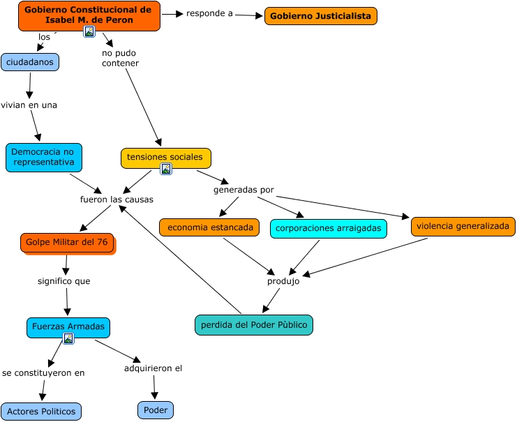 Este Cmap, tiene información relacionada con: golpe de estado 2, perdida del Poder Pùblico fueron las causas Golpe Militar del 76, tensiones sociales generadas por economia estancada, Gobierno Constitucional de Isabel M. de Peron los ciudadanos, Gobierno Constitucional de Isabel M. de Peron responde a Gobierno Justicialista, Fuerzas Armadas adquirieron el Poder, tensiones sociales generadas por violencia generalizada, Democracia no representativa fueron las causas Golpe Militar del 76, tensiones sociales generadas por corporaciones arraigadas, Fuerzas Armadas se constituyeron en Actores Politicos, tensiones sociales fueron las causas Golpe Militar del 76, Golpe Militar del 76 significo que Fuerzas Armadas, Gobierno Constitucional de Isabel M. de Peron no pudo contener tensiones sociales, corporaciones arraigadas produjo perdida del Poder Pùblico, ciudadanos vivian en una Democracia no representativa, violencia generalizada produjo perdida del Poder Pùblico, economia estancada produjo perdida del Poder Pùblico