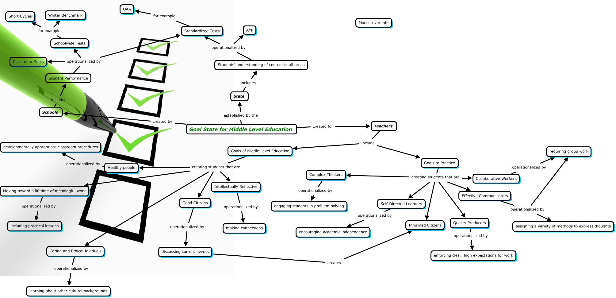 This Concept Map, created with IHMC CmapTools, has information related to: Madison, Kellen, Meghan, Quality Producers operationalized by enforcing clear, high expectations for work, Students' understanding of content in all areas operationalized by AYP, Goals of Middle Level Education creating students that are Good Citizens, Student Performance operationalized by Standardized Tests, Goals of Middle Level Education creating students that are Healthy people, Goals to Practice creating students that are Collaborative Workers, Collaborative Workers operationalized by requiring group work, Complex Thinkers operationalized by engaging students in problem-solving, Standardized Tests for example OAA, Goals to Practice creating students that are Informed Citizens, Teachers include Goals to Practice, Effective Communicators operationalized by requiring group work, Teachers include Goals of Middle Level Education, Goal State for Middle Level Education created by Schools, discussing current events creates Informed Citizens, Healthy people operationalized by developmentally appropriate classroom procedures, Goals to Practice creating students that are Quality Producers, Good Citizens operationalized by discussing current events, Student Performance operationalized by Classroom Goals, State includes Students' understanding of content in all areas