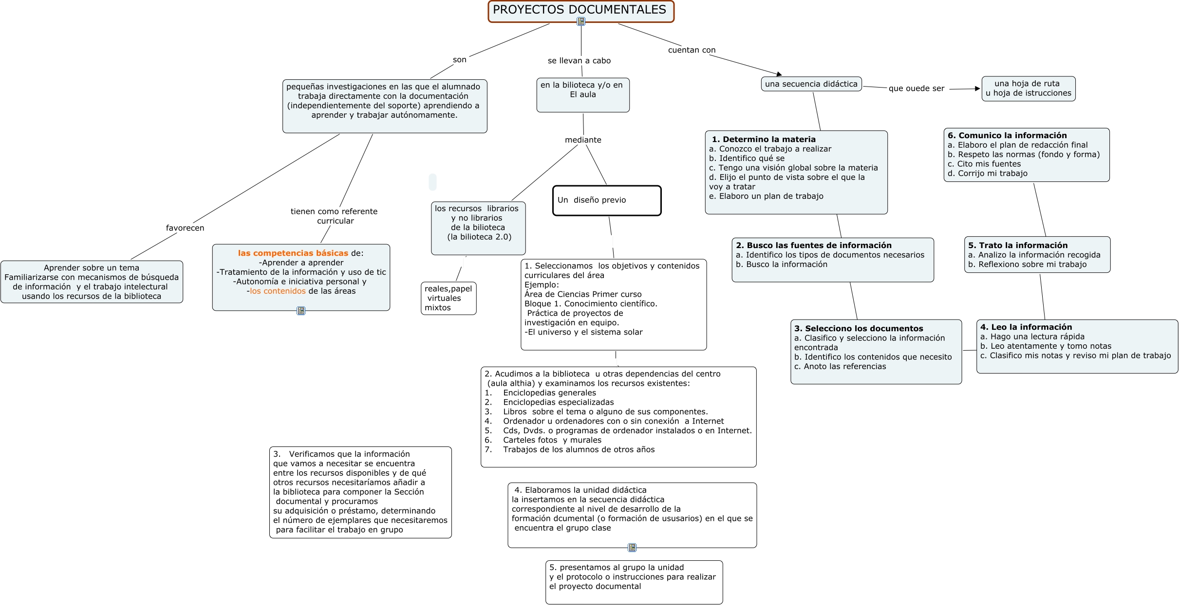 Este Cmap, tiene información relacionada con: proyectos_documentales.cmap, 3. Selecciono los documentos a. Clasifico y selecciono la información encontrada b. Identifico los contenidos que necesito c. Anoto las referencias ???? 4. Leo la información a. Hago una lectura rápida b. Leo atentamente y tomo notas c. Clasifico mis notas y reviso mi plan de trabajo, PROYECTOS DOCUMENTALES se llevan a cabo en la bilioteca y/o en El aula, una secuencia didáctica que ouede ser una hoja de ruta u hoja de istrucciones, en la bilioteca y/o en El aula mediante Un diseño previo, 1. Seleccionamos los objetivos y contenidos curriculares del área Ejemplo: Área de Ciencias Primer curso Bloque 1. Conocimiento científico. Práctica de proyectos de investigación en equipo. -El universo y el sistema solar 2. Acudimos a la biblioteca u otras dependencias del centro (aula althia) y examinamos los recursos existentes: 1. Enciclopedias generales 2. Enciclopedias especializadas 3. Libros sobre el tema o alguno de sus componentes. 4. Ordenador u ordenadores con o sin conexión a Internet 5. Cds, Dvds. o programas de ordenador instalados o en Internet. 6. Carteles fotos y murales 7. Trabajos de los alumnos de otros años, 5. Trato la información a. Analizo la información recogida b. Reflexiono sobre mi trabajo ???? 4. Leo la información a. Hago una lectura rápida b. Leo atentamente y tomo notas c. Clasifico mis notas y reviso mi plan de trabajo, pequeñas investigaciones en las que el alumnado trabaja directamente con la documentación (independientemente del soporte) aprendiendo a aprender y trabajar autónomamente. tienen como referente curricular las competencias básicas de: -Aprender a aprender -Tratamiento de la información y uso de tic -Autonomía e iniciativa personal y -los contenidos de las áreas, una secuencia didáctica paso3 3. Selecciono los documentos a. Clasifico y selecciono la información encontrada b. Identifico los contenidos que necesito c. Anoto las referencias, los recursos librarios y no librarios de la bilioteca (la bilioteca 2.0) reales,papel virtuales mixtos, PROYECTOS DOCUMENTALES son pequeñas investigaciones en las que el alumnado trabaja directamente con la documentación (independientemente del soporte) aprendiendo a aprender y trabajar autónomamente., Un diseño previo 1. Seleccionamos los objetivos y contenidos curriculares del área Ejemplo: Área de Ciencias Primer curso Bloque 1. Conocimiento científico. Práctica de proyectos de investigación en equipo. -El universo y el sistema solar, 6. Comunico la información a. Elaboro el plan de redacción final b. Respeto las normas (fondo y forma) c. Cito mis fuentes d. Corrijo mi trabajo ???? 5. Trato la información a. Analizo la información recogida b. Reflexiono sobre mi trabajo, en la bilioteca y/o en El aula mediante los recursos librarios y no librarios de la bilioteca (la bilioteca 2.0), PROYECTOS DOCUMENTALES cuentan con una secuencia didáctica, pequeñas investigaciones en las que el alumnado trabaja directamente con la documentación (independientemente del soporte) aprendiendo a aprender y trabajar autónomamente. favorecen Aprender sobre un tema Familiarizarse con mecanismos de búsqueda de información y el trabajo intelectural usando los recursos de la biblioteca
