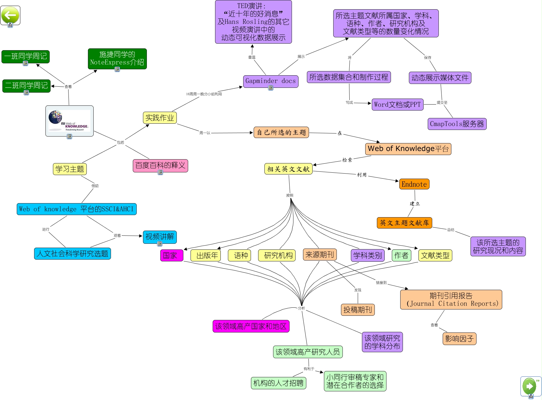 此概念图以 IHMC CmapTools 创建, 内含信息有关于: 第十一专题 ISI web of knowledge, 研究机构 分析 该领域研究 的学科分布, 相关英文文献 按照 作者, 人文社会科学研究选题 观看 视频讲解, 语种 分析 该领域研究 的学科分布, 所选主题文献所属国家、学科、 语种、作者、研究机构及 文献类型等的数量变化情况 将 所选数据集合和制作过程, 学习主题 借助 Web of knowledge 平台的SSCI&AHCI, 该领域高产研究人员 有利于 小同行审稿专家和 潜在合作者的选择, 相关英文文献 按照 国家, 相关英文文献 按照 出版年, 查看 施捷同学的 NoteExpress介绍, 国家 分析 该领域研究 的学科分布, Endnote 建立 英文主题文献库, 相关英文文献 利用 Endnote, 作者 分析 该领域高产国家和地区, Gapminder docs 重温 TED演讲: “近十年的好消息” 及Hans Rosling的其它 视频演讲中的 动态可视化数据展示, 查看 二班同学周记, 研究机构 分析 该领域高产研究人员, 相关英文文献 按照 文献类型, 语种 分析 该领域高产国家和地区, 出版年 分析 该领域研究 的学科分布