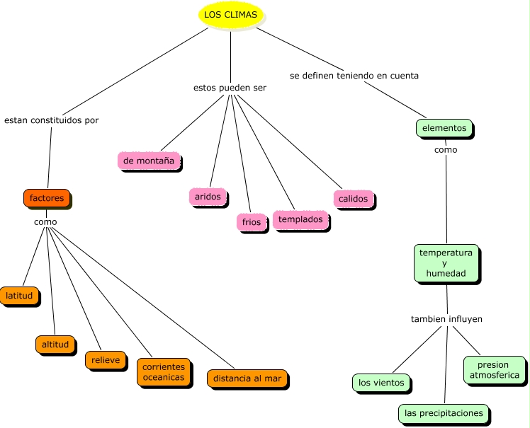 Este Cmap, tiene información relacionada con: los climas, temperatura y humedad tambien influyen los vientos, factores como relieve, LOS CLIMAS estan constituidos por factores, factores como corrientes oceanicas, LOS CLIMAS estos pueden ser templados, LOS CLIMAS se definen teniendo en cuenta elementos, LOS CLIMAS estos pueden ser de montaña, LOS CLIMAS estos pueden ser frios, factores como distancia al mar, factores como latitud, LOS CLIMAS estos pueden ser aridos, LOS CLIMAS estos pueden ser calidos, temperatura y humedad tambien influyen las precipitaciones, elementos como temperatura y humedad, factores como altitud, temperatura y humedad tambien influyen presion atmosferica