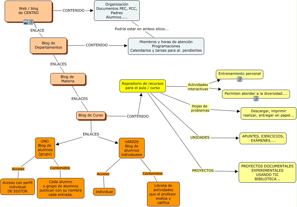 Este Cmap, tiene información relacionada con: red de blogs en un centro, Blog de Departamentos ENLACES Blog de Materia, Repositorio de recursos para el aula / curso Hojas de problemas Descargar, imprimir realizar, entregar en papel..., VARIOS Blog de alumnos individuales Contenidos Libreta de actividades que el profesor evalúa y califica, Web / blog de CENTRO ENLACE Blog de Departamentos, Blog de Curso CONTENIDO Repositorio de recursos para el aula / curso, Blog de Curso ENLACES UNO Blog de alumnos (grupo), Repositorio de recursos para el aula / curso UNIDADES APUNTES, EJERCICIOS, EXÁMENES...., UNO Blog de alumnos (grupo) Acceso Acceso con perfil individual DE EDITOR, UNO Blog de alumnos (grupo) Contenidos Cada alumno o grupo de alumnos publican con su nombre cada entrada., Blog de Departamentos CONTENIDO Miembros y horas de atención Programaciones Calendarios y tareas para al. pendientes, Blog de Curso ENLACES VARIOS Blog de alumnos individuales, Repositorio de recursos para el aula / curso PROYECTOS PROYECTOS DOCUMENTALES EXPERIMENTALES USANDO TIC BIBILOTECA..., Repositorio de recursos para el aula / curso Actividades interactivas Permiten atender a la diversidad...., Organización Documentos PEC, PCC, Padres Alumnos..... Podría estar en ambos sitios... Miembros y horas de atención Programaciones Calendarios y tareas para al. pendientes, Repositorio de recursos para el aula / curso Actividades interactivas Entrenamiento perosnal, Blog de Materia ENLACES Blog de Curso, Web / blog de CENTRO CONTENIDO Organización Documentos PEC, PCC, Padres Alumnos....., VARIOS Blog de alumnos individuales Acceso Individual