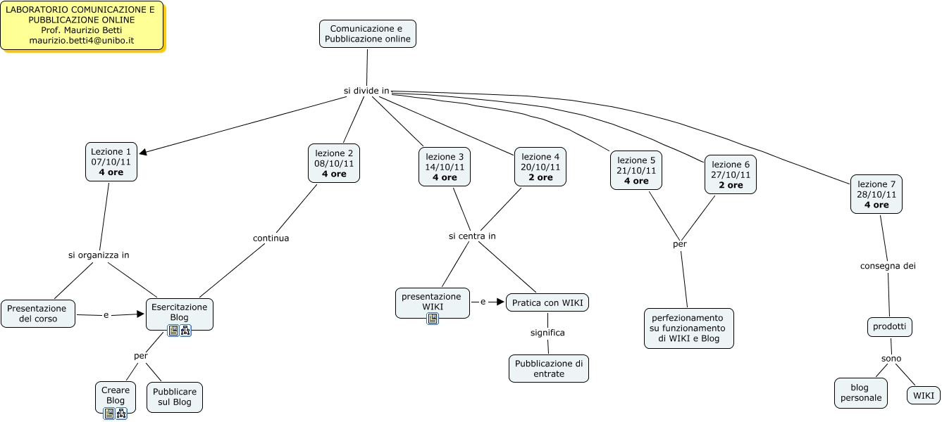 Questa Cmap, creata con IHMC CmapTools, contiene informazioni relative a: Struttura Laboratorio Comunicazone e Pubblicazione online_AA11-12, prodotti sono blog personale, Comunicazione e Pubblicazione online si divide in Lezione 1 07/10/11 4 ore, Comunicazione e Pubblicazione online si divide in lezione 7 28/10/11 4 ore, lezione 5 21/10/11 4 ore per perfezionamento su funzionamento di WIKI e Blog, lezione 2 08/10/11 4 ore continua Esercitazione Blog, Comunicazione e Pubblicazione online si divide in lezione 4 20/10/11 2 ore, Comunicazione e Pubblicazione online si divide in lezione 6 27/10/11 2 ore, lezione 4 20/10/11 2 ore si centra in presentazione WIKI, lezione 4 20/10/11 2 ore si centra in Pratica con WIKI, lezione 3 14/10/11 4 ore si centra in presentazione WIKI, lezione 3 14/10/11 4 ore si centra in Pratica con WIKI, prodotti sono WIKI, Lezione 1 07/10/11 4 ore si organizza in Esercitazione Blog, Pratica con WIKI significa Pubblicazione di entrate, Comunicazione e Pubblicazione online si divide in lezione 5 21/10/11 4 ore, Comunicazione e Pubblicazione online si divide in lezione 3 14/10/11 4 ore, lezione 7 28/10/11 4 ore consegna dei prodotti, Esercitazione Blog per Creare Blog, Esercitazione Blog per Pubblicare sul Blog, lezione 6 27/10/11 2 ore per perfezionamento su funzionamento di WIKI e Blog