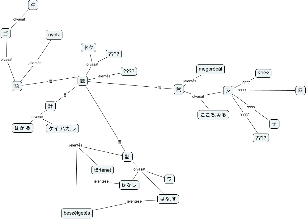 This Concept Map, created with IHMC CmapTools, has information related to: kanjik20111007p, 試 olvasat こころ.みる, 読 言 試, シ ???? 四, 読 jelentés ????, 話 olvasat はな.す, 語 言 読, 話 olvasat はなし, 試 olvasat シ, 試 jelentés megpróbál, 話 olvasat ワ, 読 言 話, ゴ olvasat 午, シ ???? ????, 読 olvasat ????, 読 olvasat ドク, történet jelentése はなし, ケイ ハカ.ラ olvasat はか.る, 語 jelentés nyelv, 語 olvasat ゴ, 計 olvasat はか.る