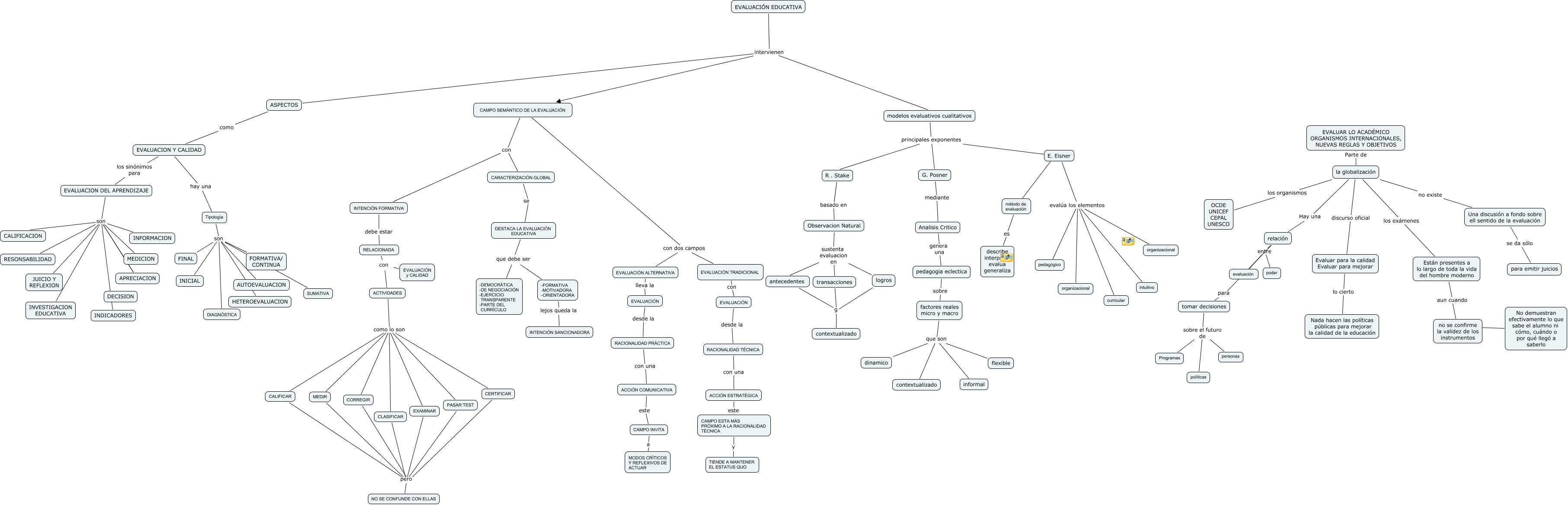 Este Cmap, tiene información relacionada con: EVALUACION1, Evaluar para la calidad Evaluar para mejorar lo cierto Nada hacen las políticas públicas para mejorar la calidad de la educación, modelos evaluativos cualitativos principales exponentes R . Stake, ACTIVIDADES como lo son CLASIFICAR, DESTACA LA EVALUACIÓN EDUCATIVA que debe ser -DEMOCRÁTICA -DE NEGOCIACIÓN -EJERCICIO TRANSPARENTE -PARTE DEL CURRÍCULO, Analisis Critico genera una pedagogia eclectica, EVALUACION DEL APRENDIZAJE son INVESTIGACION EDUCATIVA, Observacion Natural sustenta evaluacion en antecedentes, factores reales micro y macro que son informal, EVALUACION Y CALIDAD hay una Tipología, CAMPO SEMÁNTICO DE LA EVALUACIÓN con dos campos EVALUACIÓN TRADICIONAL, antecedentes g contextualizado, CORREGIR pero NO SE CONFUNDE CON ELLAS, CLASIFICAR pero NO SE CONFUNDE CON ELLAS, PASAR TEST pero NO SE CONFUNDE CON ELLAS, factores reales micro y macro que son flexible, CAMPO SEMÁNTICO DE LA EVALUACIÓN con dos campos EVALUACIÓN ALTERNATIVA, ACTIVIDADES como lo son MEDIR, EVALUACIÓN EDUCATIVA intervienen ASPECTOS, método de evaluación es describe interpreta evalua generaliza, R . Stake basado en Observacion Natural