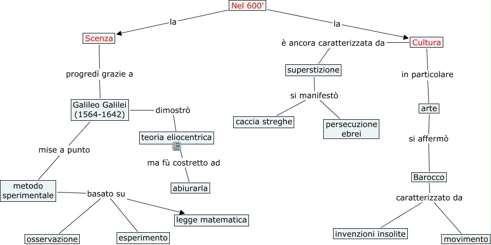 Questa Cmap, creata con IHMC CmapTools, contiene informazioni relative a: avvenimenti nel 600', Scenza progredì grazie a Galileo Galilei (1564-1642), Galileo Galilei (1564-1642) mise a punto metodo sperimentale, Nel 600' la Cultura, metodo sperimentale basato su legge matematica, teoria eliocentrica ma fù costretto ad abiurarla, metodo sperimentale basato su esperimento, arte si affermò Barocco, Galileo Galilei (1564-1642) dimostrò teoria eliocentrica, superstizione si manifestò persecuzione ebrei, Nel 600' la Scenza, metodo sperimentale basato su osservazione, superstizione si manifestò caccia streghe, Barocco caratterizzato da invenzioni insolite, Cultura in particolare arte, Barocco caratterizzato da movimento, Cultura è ancora caratterizzata da superstizione