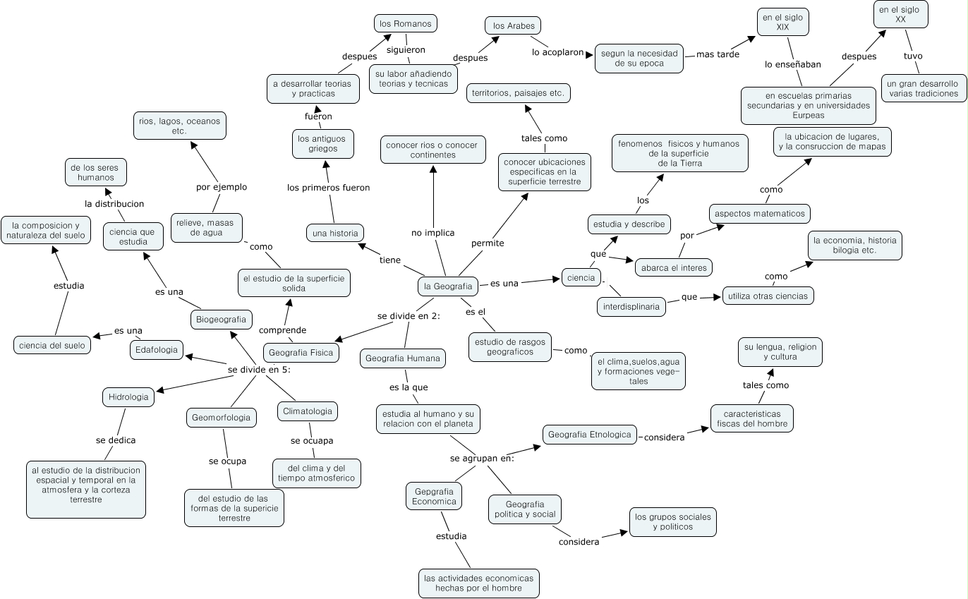 Este Cmap, tiene información relacionada con: Mapa de geografia, interdisplinaria que utiliza otras ciencias, la Geografia se divide en 2: Geografia Fisica, estudia al humano y su relacion con el planeta se agrupan en: Geografia Etnologica, su labor añadiendo teorias y tecnicas despues los Arabes, Geografia Humana es la que estudia al humano y su relacion con el planeta, en el siglo XX tuvo un gran desarrollo varias tradiciones, caracteristicas fiscas del hombre tales como su lengua, religion y cultura, la Geografia permite conocer ubicaciones especificas en la superficie terrestre, una historia los primeros fueron los antiguos griegos, los antiguos griegos fueron a desarrollar teorias y practicas, a desarrollar teorias y practicas despues los Romanos, en el siglo XIX lo enseñaban en escuelas primarias secundarias y en universidades Eurpeas, Biogeografia es una ciencia que estudia, ciencia interdisplinaria, ciencia que estudia la distribucion de los seres humanos, Gepgrafia Economica estudia las actividades economicas hechas por el hombre, ciencia del suelo estudia la composicion y naturaleza del suelo, utiliza otras ciencias como la economia, historia bilogia etc., la Geografia se divide en 2: Geografia Humana, en escuelas primarias secundarias y en universidades Eurpeas despues en el siglo XX