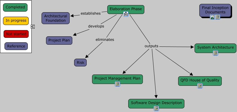 This Concept Map, created with IHMC CmapTools, has information related to: Elaboration Phase, Elaboration Phase eliminates Risk, Elaboration Phase establishes Architectural Foundation, Elaboration Phase outputs Project Management Plan, Elaboration Phase outputs Software Design Description, Elaboration Phase outputs QFD House of Quality, Elaboration Phase outputs System Architecture, Elaboration Phase develops Project Plan