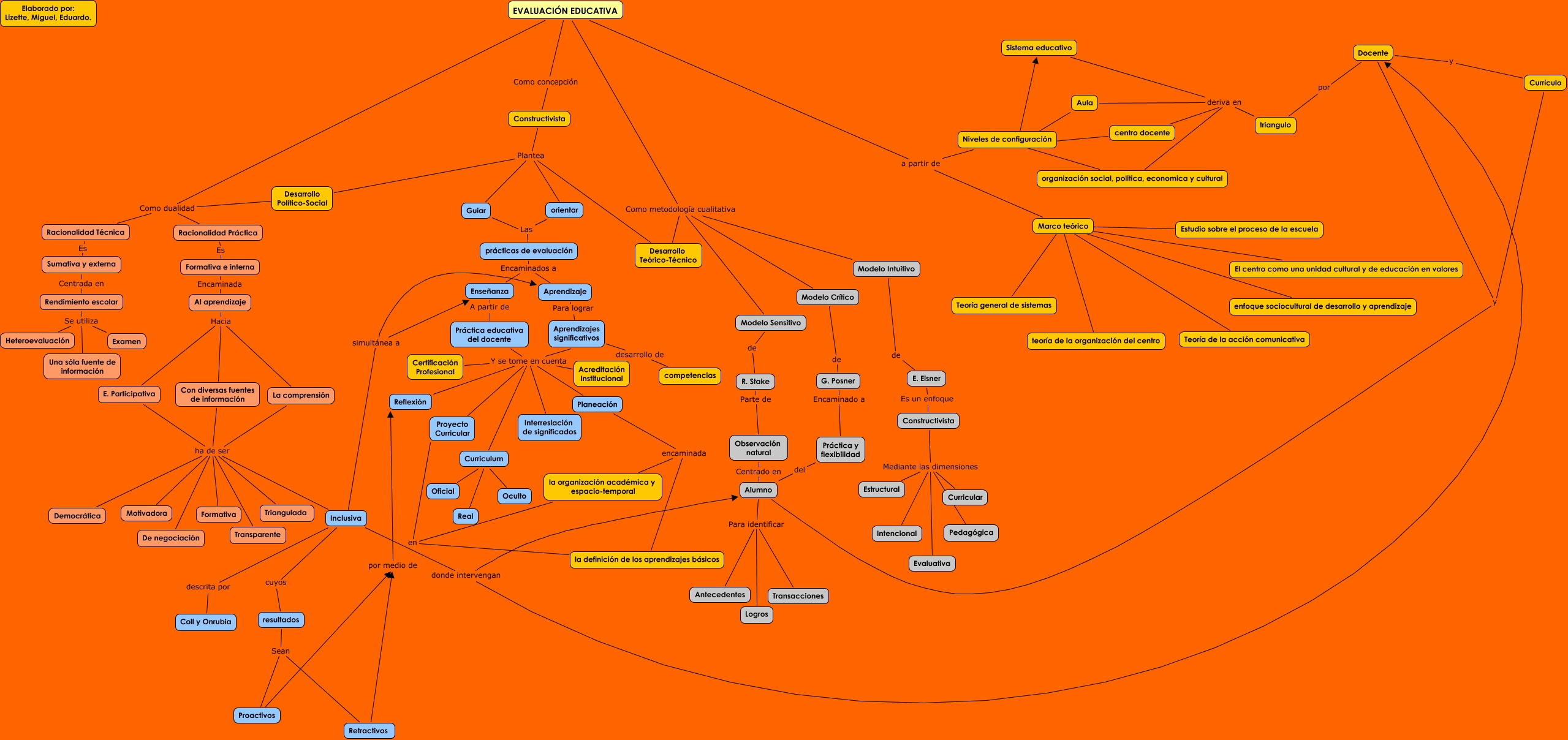 Este Cmap, tiene información relacionada con: Mapa Conceptual Liz, Miguel, Eduardo, Curriculum ???? Real, Al aprendizaje Hacia E. Participativa, Constructivista Mediante las dimensiones Curricular, La comprensión ha de ser De negociación, Niveles de configuración ???? Sistema educativo, orientar Las prácticas de evaluación, EVALUACIÓN EDUCATIVA Como metodología cualitativa Modelo Crítico, Constructivista Plantea Desarrollo Político-Social, Marco teórico ???? El centro como una unidad cultural y de educación en valores, Enseñanza A partir de Práctica educativa del docente, Aula deriva en triangulo, Inclusiva donde intervengan Alumno, Marco teórico ???? Teoría de la acción comunicativa, Marco teórico ???? teoría de la organización del centro, resultados Sean Retractivos, Sistema educativo deriva en triangulo, Racionalidad Técnica Es Sumativa y externa, Al aprendizaje Hacia La comprensión, E. Participativa ha de ser De negociación, Niveles de configuración ???? centro docente