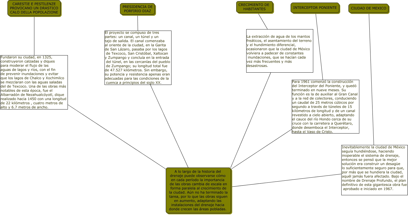 Este Cmap, tiene información relacionada con: DESAGUE DE CD DE MEXICO, CIUDAD DE MEXICO Inevitablemente la ciudad de México seguía hundiéndose, haciendo inoperable el sistema de drenaje, entonces se pensó que la mejor solución era construir un desagüe lo suficientemente seguro para que, por más que se hundiera la ciudad, aquél jamás fuera afectado. Bajo el nombre de Drenaje Profundo, el plan definitivo de esta gigantesca obra fue aprobado e iniciado en 1967. A lo largo de la historia del drenaje puede observarse cómo en cada período la importancia de las obras cambia de escala en forma paralela al crecimiento de la ciudad. Aún no ha terminado la tarea, por lo que las obras siguen en aumento, adaptando las instalaciones del drenaje hacia donde crecen las áreas pobladas., CRECIMIENTO DE HABITANTES La extracción de agua de los mantos freáticos, el asentamiento del terreno y el hundimiento diferencial, ocasionaron que la ciudad de México volviera a padecer de constantes inundaciones, que se hacían cada vez más frecuentes y más desastrosas. A lo largo de la historia del drenaje puede observarse cómo en cada período la importancia de las obras cambia de escala en forma paralela al crecimiento de la ciudad. Aún no ha terminado la tarea, por lo que las obras siguen en aumento, adaptando las instalaciones del drenaje hacia donde crecen las áreas pobladas., CARESTIE E PESTILENZE PROVOCANO UN DRASTICO CALO DELLA POPOLAZIONE Fundaron su ciudad, en 1325, construyeron calzadas y diques para moderar el flujo de las aguas de lagos y ríos, con el fin de prevenir inundaciones y evitar que los lagos de Chalco y Xochimilco se mezclaran con las aguas saladas del de Texcoco. Una de las obras más notables de esta época, fue el Albarradón de Nezahualcóyotl, dique realizado hacia 1450 con una longitud de 22 kilómetros , cuatro metros de alto y 6.7 metros de ancho. A lo largo de la historia del drenaje puede observarse cómo en cada período la importancia de las obras cambia de escala en forma paralela al crecimiento de la ciudad. Aún no ha terminado la tarea, por lo que las obras siguen en aumento, adaptando las instalaciones del drenaje hacia donde crecen las áreas pobladas., PRESIDENCIA DE PORFIRIO DIAZ El proyecto se compuso de tres partes: un canal, un túnel y un tajo de salida. El canal comenzaba al oriente de la ciudad, en la Garita de San Lázaro, pasaba por los lagos de Texcoco, San Cristóbal, Xaltocan y Zumpango y concluía en la entrada del túnel, en las cercanías del pueblo de Zumpango; su longitud total fue de 47.527 kilómetros. Sin embargo, su potencia y resistencia apenas eran adecuadas para las condiciones de la cuenca a principios del siglo XX. A lo largo de la historia del drenaje puede observarse cómo en cada período la importancia de las obras cambia de escala en forma paralela al crecimiento de la ciudad. Aún no ha terminado la tarea, por lo que las obras siguen en aumento, adaptando las instalaciones del drenaje hacia donde crecen las áreas pobladas., INTERCEPTOR PONIENTE Para 1961 comenzó la construcción del Interceptor del Poniente, y quedó terminado en nueve meses. Su función es la de auxiliar al Gran Canal y a la red de colectores, conduciendo un caudal de 25 metros cúbicos por segundo a través de túneles de 15 kilómetros de longitud y de un canal revestido a cielo abierto, adaptando el cauce del río Hondo cerca de su cruce con la carretera a Querétaro, donde desemboca el Interceptor, hasta el Vaso de Cristo. A lo largo de la historia del drenaje puede observarse cómo en cada período la importancia de las obras cambia de escala en forma paralela al crecimiento de la ciudad. Aún no ha terminado la tarea, por lo que las obras siguen en aumento, adaptando las instalaciones del drenaje hacia donde crecen las áreas pobladas.