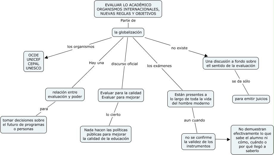 Este Cmap, tiene información relacionada con: evaluaciones internacionales, no se confirme la validez de los instrumentos ???? No demuestran efectivamente lo que sabe el alumno ni cómo, cuándo o por qué llegó a saberlo, Una discusión a fondo sobre ell sentido de la evaluación se da sólo para emitir juicios, la globalización discurso oficial Evaluar para la calidad Evaluar para mejorar, Evaluar para la calidad Evaluar para mejorar lo cierto Nada hacen las políticas públicas para mejorar la calidad de la educación, la globalización Hay una relación entre evaluación y poder, EVALUAR LO ACADÉMICO ORGANISMOS INTERNACIONALES, NUEVAS REGLAS Y OBJETIVOS Parte de la globalización, la globalización los organismos OCDE UNICEF CEPAL UNESCO, la globalización no existe Una discusión a fondo sobre ell sentido de la evaluación, la globalización los exámenes Están presentes a lo largo de toda la vida del hombre moderno, relación entre evaluación y poder para tomar decisiones sobre el futuro de programas o personas, Están presentes a lo largo de toda la vida del hombre moderno aun cuando no se confirme la validez de los instrumentos