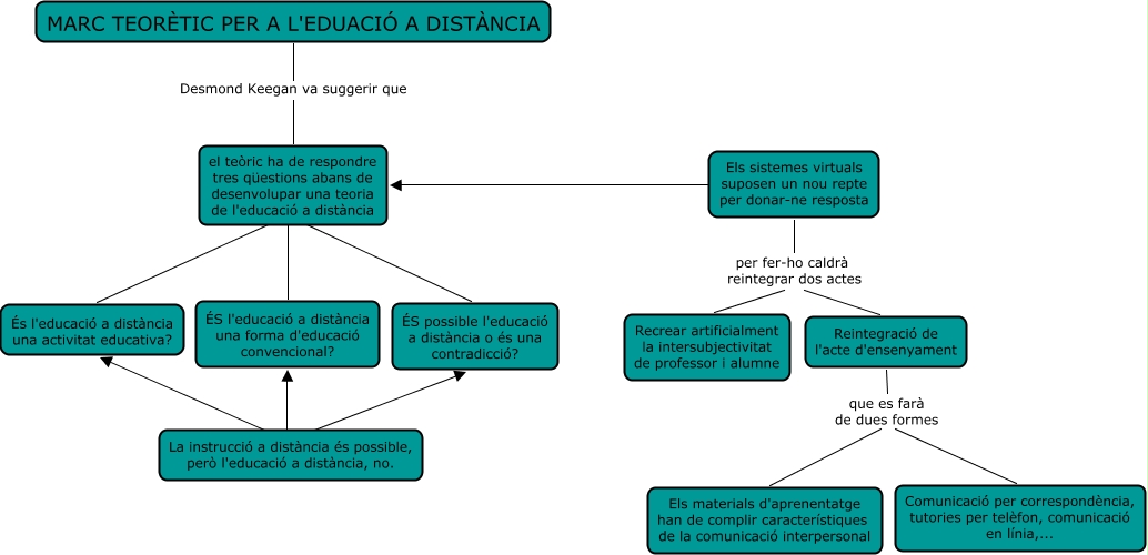 Aquest mapa conceptual conté informació relacionada amb: 8) Marc teorètic per a l'educació a distància, el teòric ha de respondre tres qüestions abans de desenvolupar una teoria de l'educació a distància ???? És l'educació a distància una activitat educativa?, La instrucció a distància és possible, però l'educació a distància, no. ???? ÉS l'educació a distància una forma d'educació convencional?, Els sistemes virtuals suposen un nou repte per donar-ne resposta ???? el teòric ha de respondre tres qüestions abans de desenvolupar una teoria de l'educació a distància, Reintegració de l'acte d'ensenyament que es farà de dues formes Comunicació per correspondència, tutories per telèfon, comunicació en línia,..., el teòric ha de respondre tres qüestions abans de desenvolupar una teoria de l'educació a distància ???? ÉS l'educació a distància una forma d'educació convencional?, La instrucció a distància és possible, però l'educació a distància, no. ???? És l'educació a distància una activitat educativa?, Els sistemes virtuals suposen un nou repte per donar-ne resposta per fer-ho caldrà reintegrar dos actes Recrear artificialment la intersubjectivitat de professor i alumne, MARC TEORÈTIC PER A L'EDUACIÓ A DISTÀNCIA Desmond Keegan va suggerir que el teòric ha de respondre tres qüestions abans de desenvolupar una teoria de l'educació a distància, Reintegració de l'acte d'ensenyament que es farà de dues formes Els materials d'aprenentatge han de complir característiques de la comunicació interpersonal, Els sistemes virtuals suposen un nou repte per donar-ne resposta per fer-ho caldrà reintegrar dos actes Reintegració de l'acte d'ensenyament, el teòric ha de respondre tres qüestions abans de desenvolupar una teoria de l'educació a distància ???? ÉS possible l'educació a distància o és una contradicció?, La instrucció a distància és possible, però l'educació a distància, no. ???? ÉS possible l'educació a distància o és una contradicció?