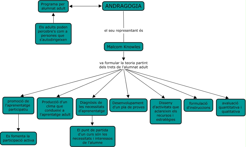 Aquest mapa conceptual conté informació relacionada amb: 5) Teories de l'Educacio - T. de l'andragogia, ANDRAGOGIA ???? Programa per alumnat adult, Malcom Knowles va formular la teoria partint dels trets de l'alumnat adult Desenvolupament d'un pla de proves, Malcom Knowles va formular la teoria partint dels trets de l'alumnat adult formulació d'instruccions, Malcom Knowles va formular la teoria partint dels trets de l'alumnat adult Producció d'un clima que condueixi a l'aprentatge adult, Diagnòsis de les necessitats d'aprenentatge ???? El punt de partida d'un curs són les necessitats i interessos de l'alumne, Malcom Knowles va formular la teoria partint dels trets de l'alumnat adult promoció de l'aprenentatge participatiu, ANDRAGOGIA el seu representant és Malcom Knowles, promoció de l'aprenentatge participatiu ???? Es fomenta la participació activa, Malcom Knowles va formular la teoria partint dels trets de l'alumnat adult Diagnòsis de les necessitats d'aprenentatge, Malcom Knowles va formular la teoria partint dels trets de l'alumnat adult Disseny d'activitats que aclareixin els recursos i estratègies, Malcom Knowles va formular la teoria partint dels trets de l'alumnat adult avaluació quantitativa i qualitativa, Els adults poden percebre's com a persones que s'autodirigeixen ???? Programa per alumnat adult
