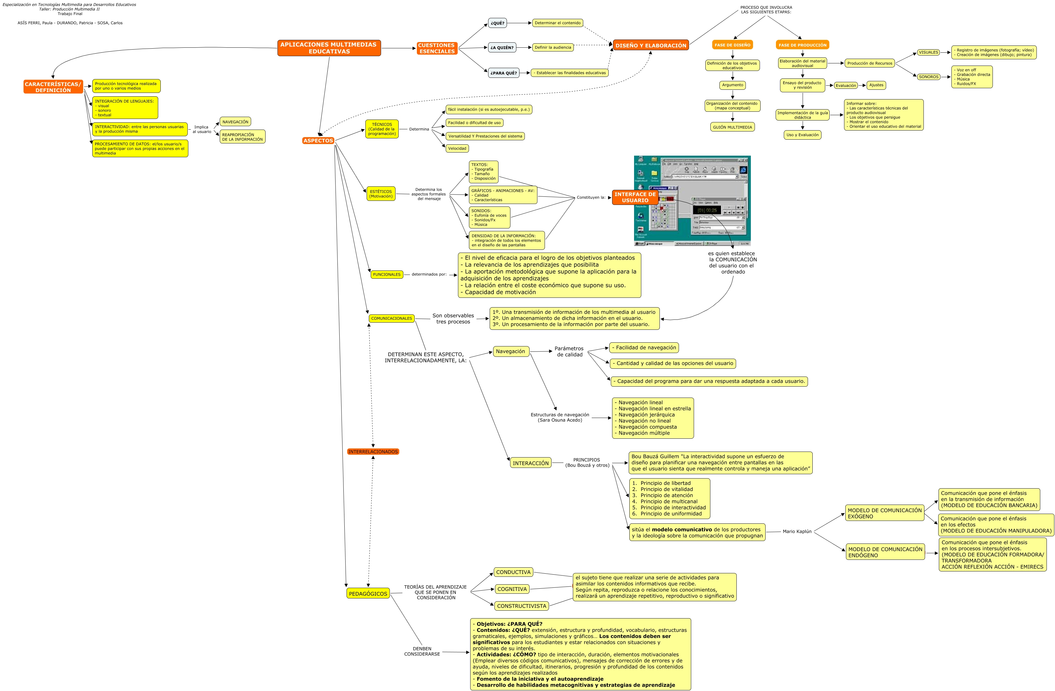 Este Cmap, tiene información relacionada con: PRODUCCIÓN MULTIMEDIA II, INTERACCIÓN PRINCIPIOS (Bou Bouzá y otros) Bou Bauzá Guillem "La interactividad supone un esfuerzo de diseño para planificar una navegación entre pantallas en las que el usuario sienta que realmente controla y maneja una aplicación”, GRÁFICOS - ANIMACIONES - AV: - Calidad - Características Constituyen la: INTERFACE DE USUARIO, APLICACIONES MULTIMEDIAS EDUCATIVAS CARACTERÍSTICAS/ DEFINICIÓN PROCESAMIENTO DE DATOS: el/los usuario/s puede participar con sus propias acciones en el multimedia, TÉCNICOS (Calidad de la programación) Determina fácil instalación (si es autoejecutable, p.e.), APLICACIONES MULTIMEDIAS EDUCATIVAS CUESTIONES ESENCIALES ¿A QUIÉN?, Producción de Recursos SONOROS - Voz en off - Grabación directa - Música - Ruidos/FX, CONDUCTIVA ???? el sujeto tiene que realizar una serie de actividades para asimilar los contenidos informativos que recibe. Según repita, reproduzca o relacione los conocimientos, realizará un aprendizaje repetitivo, reproductivo o significativo, APLICACIONES MULTIMEDIAS EDUCATIVAS ASPECTOS COMUNICACIONALES, MODELO DE COMUNICACIÓN EXÓGENO ???? Comunicación que pone el énfasis en la transmisión de información (MODELO DE EDUCACIÓN BANCARIA), FASE DE PRODUCCIÓN Elaboración del material audiovisual Ensayo del producto y revisión, APLICACIONES MULTIMEDIAS EDUCATIVAS ASPECTOS PEDAGÓGICOS, COMUNICACIONALES DETERMINAN ESTE ASPECTO, INTERRELACIONADAMENTE, LA: INTERACCIÓN, Ensayo del producto y revisión Implementación de la guía didáctica Informar sobre: - Las características técnicas del producto audiovisual - Los objetivos que persigue - Mostrar el contenido - Orientar el uso educativo del material, INTERACTIVIDAD: entre las personas usuarias y la producción misma Implica al usuario REAPROPIACIÓN DE LA INFORMACIÓN, TEXTOS: - Tipografía - Tamaño - Disposición Constituyen la: INTERFACE DE USUARIO, PEDAGÓGICOS TEORÍAS DEL APRENDIZAJE QUE SE PONEN EN CONSIDERACIÓN CONSTRUCTIVISTA, COGNITIVA ???? el sujeto tiene que realizar una serie de actividades para asimilar los contenidos informativos que recibe. Según repita, reproduzca o relacione los conocimientos, realizará un aprendizaje repetitivo, reproductivo o significativo, COMUNICACIONALES INTERRELACIONADOS PEDAGÓGICOS, APLICACIONES MULTIMEDIAS EDUCATIVAS CUESTIONES ESENCIALES ¿PARA QUÉ?, TÉCNICOS (Calidad de la programación) Determina Facilidad o dificultad de uso