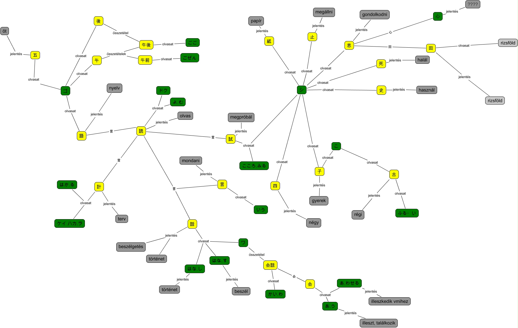 This Concept Map, created with IHMC CmapTools, has information related to: kanjik20111020, 史 jelentés használ, 思 心 心, シ olvasat 死, 計 olvasat はか.る, 読 言 言, あ.わせる jelentés illeszkedik vmihez, ケイ ハカ.ラ olvasat はか.る, 読 言 計, 話 olvasat はな.す, 試 jelentés megpróbál, 読 jelentés olvas, ゴ olvasat 午, 思 jelentés gondolkodni, 話 jelentés történet, はな.す jelentés beszél, ごぜん olvasat 午前, 死 jelentés halál, 子 jelentés gyerek, 古 olvasat ふる・い, 会話 会 会