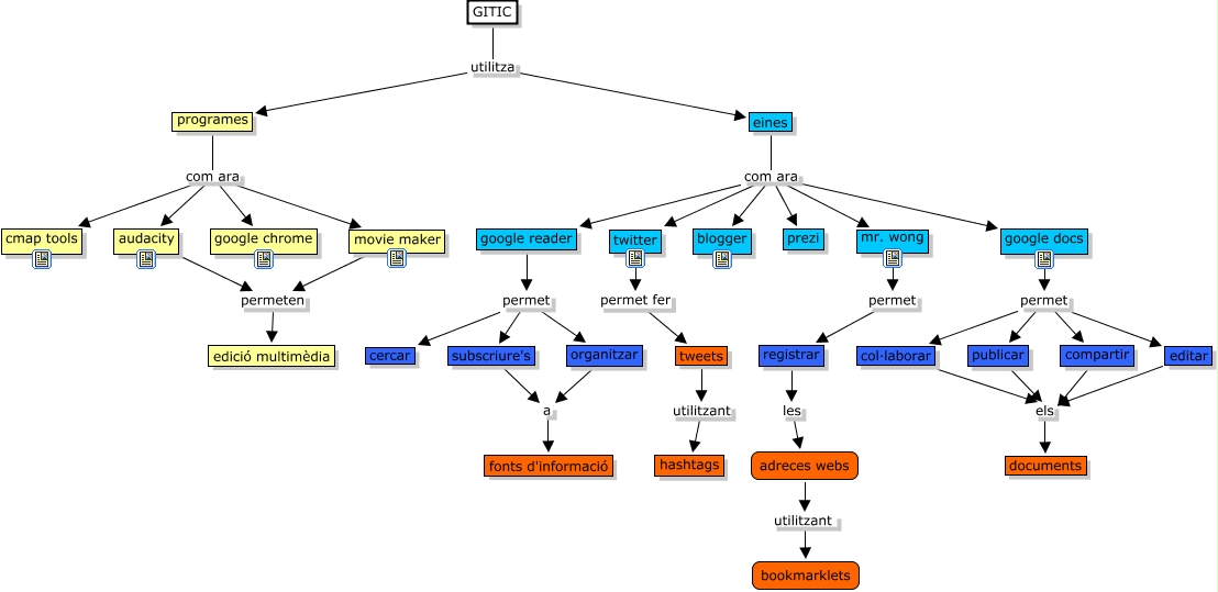 Aquest mapa conceptual conté informació relacionada amb: GITIC, GITIC utilitza programes, eines com ara google reader, GITIC utilitza eines, eines com ara twitter, col·laborar els documents, programes com ara google chrome, eines com ara google docs, google docs permet editar, organitzar a fonts d'informació, programes com ara cmap tools, google reader permet subscriure's, compartir els documents, programes com ara movie maker, registrar les adreces webs, publicar els documents, subscriure's a fonts d'informació, eines com ara prezi, tweets utilitzant hashtags, eines com ara mr. wong, editar els documents