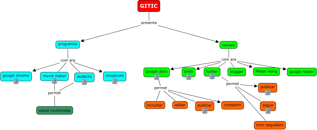 Aquest mapa conceptual conté informació relacionada amb: Elisabet Bou, programes com ara cmaptools, google docs permet compartir, serveis com ara google reader, google docs permet editar, serveis com ara Mister wong, twitter permet seguir, programes com ara google chrome, GITIC presenta programes, serveis com ara blogger, programes com ara movie maker, programes com ara audacity, GITIC presenta serveis, audacity permet edició multimèdia, twitter permet tenir seguidors, twitter permet publicar, serveis com ara twitter, google docs permet incrustar, movie maker permet edició multimèdia, serveis com ara prezi, serveis com ara google docs