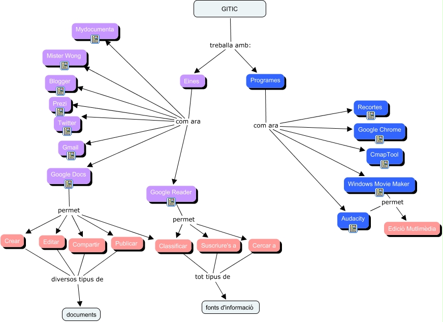 Aquest mapa conceptual conté informació relacionada amb: GITIC (idea general), Eines com ara Google Reader, Programes com ara Recortes, Programes com ara Google Chrome, Windows Movie Maker permet Edició Mutlimèdia, Eines com ara Blogger, Eines com ara Twitter, Google Docs permet Crear, Eines com ara Gmail, Google Reader permet Cercar a, Classificar tot tipus de fonts d'informació, Compartir diversos tipus de documents, Programes com ara Audacity, Programes com ara CmapTool, Google Docs permet Compartir, Google Docs permet Editar, Programes com ara Windows Movie Maker, Eines com ara Google Docs, Crear diversos tipus de documents, Cercar a tot tipus de fonts d'informació, Audacity permet Edició Mutlimèdia