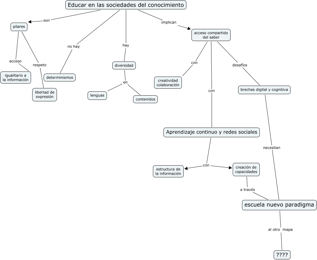 Este Cmap, tiene información relacionada con: Hacia las Ss del conocimiento, acceso compartido del saber con Aprendizaje continuo y redes sociales, Aprendizaje continuo y redes sociales con creación de capacidades, Educar en las sociedades del conocimiento hay diversidad, diversidad en lenguas, brechas digital y cognitiva necesitan escuela nuevo paradigma, creación de capacidades a través escuela nuevo paradigma, diversidad en contenidos, pilares respeto libertad de expresión, Educar en las sociedades del conocimiento son pilares, pilares acceso igualitario a la información, Aprendizaje continuo y redes sociales con estructura de la información, Educar en las sociedades del conocimiento implican acceso compartido del saber, escuela nuevo paradigma al otro mapa ????, Educar en las sociedades del conocimiento no hay determinismos, acceso compartido del saber con creatividad colaboración, acceso compartido del saber desafíos brechas digital y cognitiva