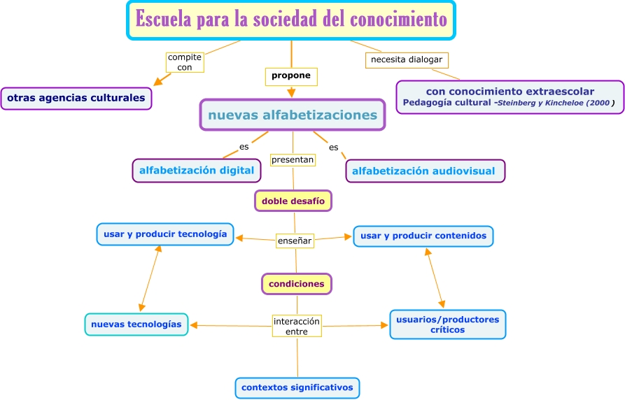 Este Cmap, tiene información relacionada con: Nuevas alfabetizaciones editando, Escuela para la sociedad del conocimiento necesita dialogar con conocimiento extraescolar Pedagogía cultural -Steinberg y Kincheloe (2000), condiciones interacción entre usuarios/productores críticos, nuevas alfabetizaciones es alfabetización audiovisual, Escuela para la sociedad del conocimiento propone nuevas alfabetizaciones, doble desafío enseñar usar y producir contenidos, condiciones interacción entre contextos significativos, nuevas tecnologías ???? usar y producir tecnología, usuarios/productores críticos ???? usar y producir contenidos, nuevas alfabetizaciones presentan doble desafío, condiciones interacción entre nuevas tecnologías, Escuela para la sociedad del conocimiento compite con otras agencias culturales, doble desafío enseñar condiciones, nuevas alfabetizaciones es alfabetización digital, doble desafío enseñar usar y producir tecnología