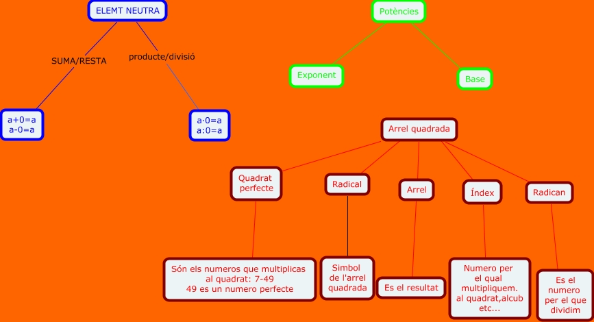 Aquest mapa conceptual conté informació relacionada amb: Potencies,Element neutra, Arrel quadrada, Arrel quadrada Arrel, Arrel ???? Es el resultat, Arrel quadrada ???? Radican, Potències ???? Exponent, Índex ???? Numero per el qual multipliquem. al quadrat,alcub etc..., Radical ???? Simbol de l'arrel quadrada, Arrel quadrada ???? Quadrat perfecte, ELEMT NEUTRA producte/divisió a·0=a a:0=a, Arrel quadrada ???? Índex, Arrel quadrada ???? Radical, ELEMT NEUTRA SUMA/RESTA a+0=a a-0=a, Potències ???? Base, Radican ???? Es el numero per el que dividim, Quadrat perfecte ???? Són els numeros que multiplicas al quadrat: 7-49 49 es un numero perfecte