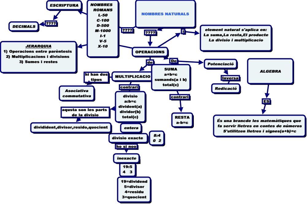Este Cmap, tiene información relacionada con: nombres naturals, divisio exacte ho si noo inexacte, Potenciació Inversa Redicació, MULTIPLICACIO contrari divisio a:b=c divident(a) dividor(b) total(c), MULTIPLICACIO hi han dos tipus Asociativa commutativa, 19:5 4 3 ???? inexacte, ALGEBRA ES És una brancde les matemàtiques que fa servir lletres en contes de números S'utilitzen lletres i signes(a+b)=c, OPERACIONS i element natural s'aplica en: La suma,La resta,El producte La divisio i multiplicacio, SUMA a+b=c sumands(a i b) total(c) contrari RESTA a-b=c, OPERACIONS De Potenciació, NOMBRES NATURALS ???? OPERACIONS, ESCRIPTURA ???? DECIMALS, OPERACIONS la JERARQUIA 1) Operacions entre parèntesis 2) Multiplicacions i divisions 3) Sumes i restes, OPERACIONS de MULTIPLICACIO, NOMBRES NATURALS ???? ESCRIPTURA, divisio a:b=c divident(a) dividor(b) total(c) aqusta son les parts de la divisio dividident,divisor,resido,quocient, OPERACIONS de SUMA a+b=c sumands(a i b) total(c), divisio exacte ???? 8:4 0 2