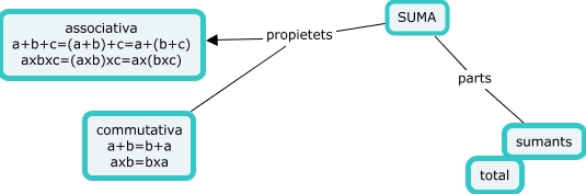 Aquest mapa conceptual conté informació relacionada amb: suma, SUMA propietets associativa a+b+c=(a+b)+c=a+(b+c) axbxc=(axb)xc=ax(bxc), SUMA propietets commutativa a+b=b+a axb=bxa, SUMA parts sumants