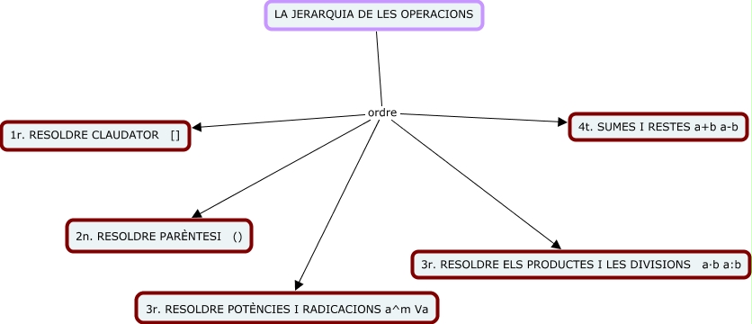 Aquest mapa conceptual conté informació relacionada amb: JERARQUIA D'OPERACIONS, LA JERARQUIA DE LES OPERACIONS ordre 1r. RESOLDRE CLAUDATOR [], LA JERARQUIA DE LES OPERACIONS ordre 4t. SUMES I RESTES a+b a-b, LA JERARQUIA DE LES OPERACIONS ordre 3r. RESOLDRE POTÈNCIES I RADICACIONS a^m Va, LA JERARQUIA DE LES OPERACIONS ordre 2n. RESOLDRE PARÈNTESI (), LA JERARQUIA DE LES OPERACIONS ordre 3r. RESOLDRE ELS PRODUCTES I LES DIVISIONS a·b a:b