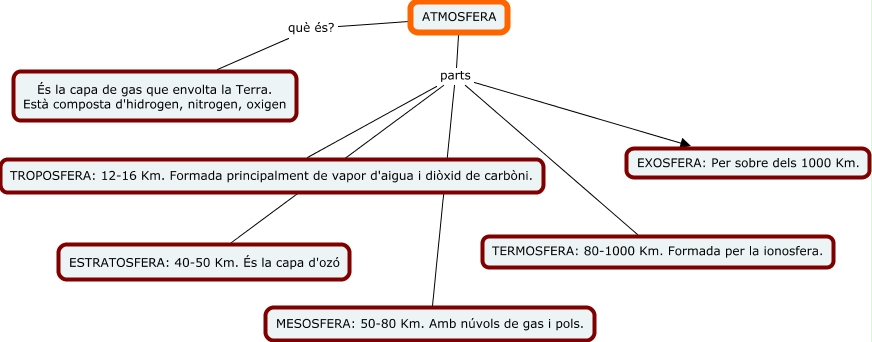 Aquest mapa conceptual conté informació relacionada amb: ATMOSFERA, ATMOSFERA parts MESOSFERA: 50-80 Km. Amb núvols de gas i pols., ATMOSFERA parts TERMOSFERA: 80-1000 Km. Formada per la ionosfera., ATMOSFERA què és? És la capa de gas que envolta la Terra. Està composta d'hidrogen, nitrogen, oxigen, ATMOSFERA parts TROPOSFERA: 12-16 Km. Formada principalment de vapor d'aigua i diòxid de carbòni., ATMOSFERA parts EXOSFERA: Per sobre dels 1000 Km., ATMOSFERA parts ESTRATOSFERA: 40-50 Km. És la capa d'ozó