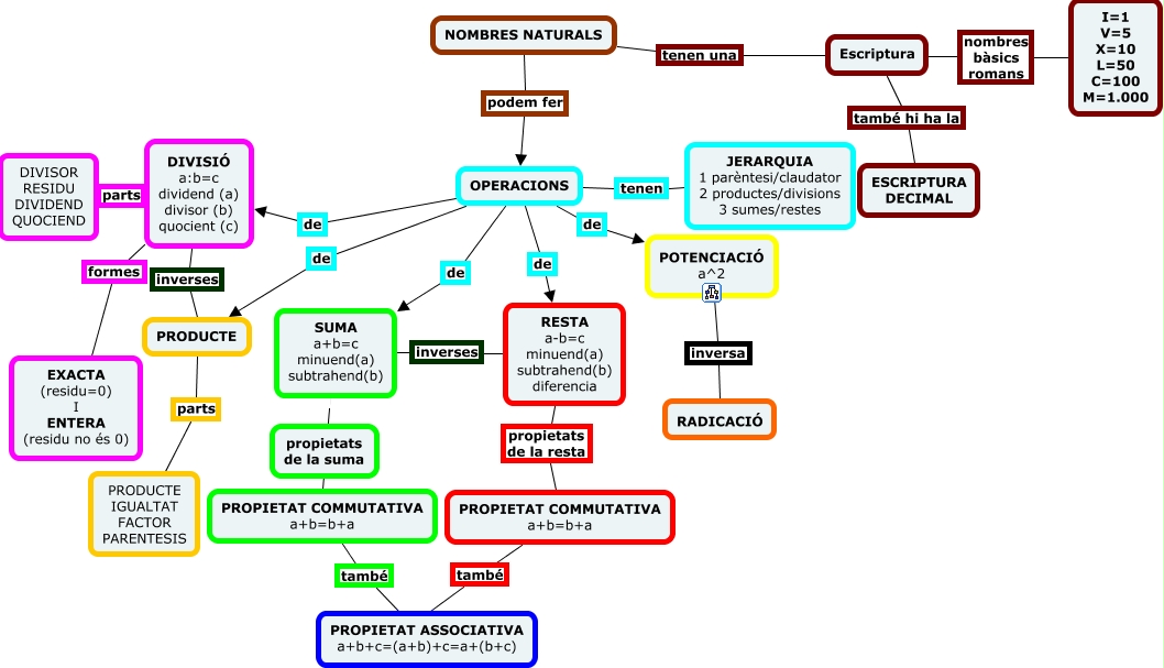 Aquest mapa conceptual conté informació relacionada amb: nombres naturals, DIVISIÓ a:b=c dividend (a) divisor (b) quocient (c) inverses PRODUCTE, Escriptura nombres bàsics romans I=1 V=5 X=10 L=50 C=100 M=1.000, OPERACIONS tenen JERARQUIA 1 parèntesi/claudator 2 productes/divisions 3 sumes/restes, PROPIETAT COMMUTATIVA a+b=b+a també PROPIETAT ASSOCIATIVA a+b+c=(a+b)+c=a+(b+c), NOMBRES NATURALS podem fer OPERACIONS, OPERACIONS de PRODUCTE, RESTA a-b=c minuend(a) subtrahend(b) diferencia propietats de la resta PROPIETAT COMMUTATIVA a+b=b+a, POTENCIACIÓ a^2 inversa RADICACIÓ, OPERACIONS de SUMA a+b=c minuend(a) subtrahend(b), DIVISIÓ a:b=c dividend (a) divisor (b) quocient (c) parts DIVISOR RESIDU DIVIDEND QUOCIEND, OPERACIONS de DIVISIÓ a:b=c dividend (a) divisor (b) quocient (c), OPERACIONS de RESTA a-b=c minuend(a) subtrahend(b) diferencia, DIVISIÓ a:b=c dividend (a) divisor (b) quocient (c) formes EXACTA (residu=0) I ENTERA (residu no és 0), SUMA a+b=c minuend(a) subtrahend(b) inverses RESTA a-b=c minuend(a) subtrahend(b) diferencia, Escriptura també hi ha la ESCRIPTURA DECIMAL, PRODUCTE parts PRODUCTE IGUALTAT FACTOR PARENTESIS, NOMBRES NATURALS tenen una Escriptura, SUMA a+b=c minuend(a) subtrahend(b) PROPIETAT COMMUTATIVA a+b=b+a, OPERACIONS de POTENCIACIÓ a^2, PROPIETAT COMMUTATIVA a+b=b+a també PROPIETAT ASSOCIATIVA a+b+c=(a+b)+c=a+(b+c)