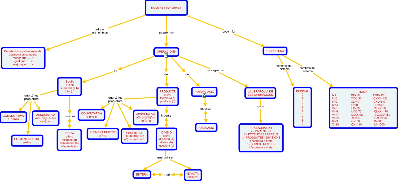 Aquest mapa conceptual conté informació relacionada amb: NOMBRES NATURALS, NOMBRES NATURALS podem fer ESCRIPTURA, DIVISIÓ a:b=c dividend (a) divisor (b) quocient (c) que pot ser ENTERA, SUMA a+b=c sumands (a,b) total (c) inversa RESTA a-b=c minuend (a) subtrahend (b) diferència (c), OPERACIONS de POTENCIACIÓ, ESCRIPTURA nombres del sistema ROMÀ I=1 XX=20 CXX=120 II=2 XXX=30 CXXX=130 III=3 XL=40 CXL=140 IV=4 L=50 CL=150 V=5 LX=60 CLX=160 VI=6 LXX=70 CLXX=170 VII=7 LXXX=80 CLXXX=180 VIII=8 XC=90 CXC=190 IX=9 C=100 D=500 X=10 CX=110 M=1000, PRODUCTE a·b=c factors (a,b) producte (c) inversa DIVISIÓ a:b=c dividend (a) divisor (b) quocient (c), SUMA a+b=c sumands (a,b) total (c) que té les propietats ELEMENT NEUTRE a+0=a, LA JERARQUIA DE LES OPERACIONS ordre 1.- CLAUDATOR 2.- PARÈNTESI 3.- POTÈNCIES I ARRELS 4.- PRODUCTES I DIVISIONS (d'esquerra a dreta) 5.- SUMES I RESTES (d'esquerra a dreta), PRODUCTE a·b=c factors (a,b) producte (c) que té les propietats ASSOCIATIVA a*b*c=(a*b)*c= =a*(b*c), OPERACIONS que segueixen LA JERARQUIA DE LES OPERACIONS, OPERACIONS de SUMA a+b=c sumands (a,b) total (c), SUMA a+b=c sumands (a,b) total (c) que té les propietats ASSOCIATIVA a+b+c=(a+b)+c= =a+(b+c), PRODUCTE a·b=c factors (a,b) producte (c) que té les propietats COMMUTATIVA a*b=b*a, ENTERA o bé EXACTA residu=0, NOMBRES NATURALS podem fer OPERACIONS, OPERACIONS de PRODUCTE a·b=c factors (a,b) producte (c), NOMBRES NATURALS ordre en els nombres Donats dos nombres naturals qualsevol es compleix: menor que ..... < igual que ..... = major que ..... >, DIVISIÓ a:b=c dividend (a) divisor (b) quocient (c) que pot ser EXACTA residu=0, PRODUCTE a·b=c factors (a,b) producte (c) que té les propietats ELEMENT NEUTRE a*1=a, POTENCIACIÓ inversa RADICACIÓ
