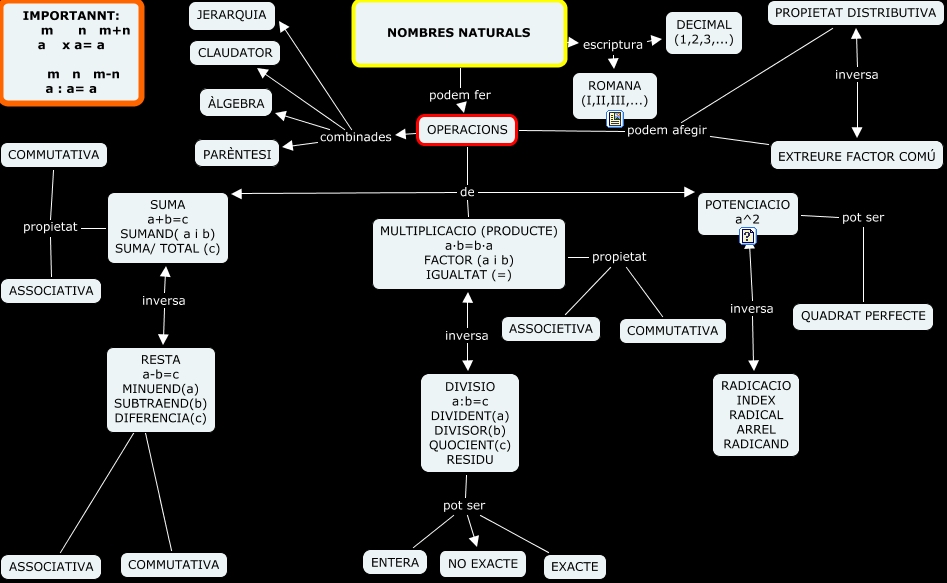 Aquest mapa conceptual conté informació relacionada amb: Nombres naturals, SUMA a+b=c SUMAND( a i b) SUMA/ TOTAL (c) propietat COMMUTATIVA, DIVISIO a:b=c DIVIDENT(a) DIVISOR(b) QUOCIENT(c) RESIDU pot ser ENTERA, OPERACIONS combinades CLAUDATOR, OPERACIONS de POTENCIACIO a^2, RESTA a-b=c MINUEND(a) SUBTRAEND(b) DIFERENCIA(c) propietat COMMUTATIVA, OPERACIONS combinades PARÈNTESI, NOMBRES NATURALS podem fer OPERACIONS, OPERACIONS podem afegir EXTREURE FACTOR COMÚ, DIVISIO a:b=c DIVIDENT(a) DIVISOR(b) QUOCIENT(c) RESIDU pot ser NO EXACTE, MULTIPLICACIO (PRODUCTE) a·b=b·a FACTOR (a i b) IGUALTAT (=) propietat COMMUTATIVA, DIVISIO a:b=c DIVIDENT(a) DIVISOR(b) QUOCIENT(c) RESIDU pot ser EXACTE, OPERACIONS de SUMA a+b=c SUMAND( a i b) SUMA/ TOTAL (c), OPERACIONS de MULTIPLICACIO (PRODUCTE) a·b=b·a FACTOR (a i b) IGUALTAT (=), RESTA a-b=c MINUEND(a) SUBTRAEND(b) DIFERENCIA(c) propietat ASSOCIATIVA, OPERACIONS combinades JERARQUIA, SUMA a+b=c SUMAND( a i b) SUMA/ TOTAL (c) propietat ASSOCIATIVA, MULTIPLICACIO (PRODUCTE) a·b=b·a FACTOR (a i b) IGUALTAT (=) propietat ASSOCIETIVA, OPERACIONS combinades ÀLGEBRA, POTENCIACIO a^2 pot ser QUADRAT PERFECTE, NOMBRES NATURALS escriptura ROMANA (I,II,III,...)