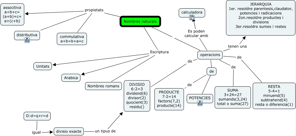 Aquest mapa conceptual conté informació relacionada amb: mates tema 1, Nombres naturals propietats commutativa a+b=b+a=c, D:d=q+r=d igual divisio exacte, Nombres naturals operacions, Nombres naturals Escriptura Nombres romans, Nombres naturals Escriptura Arabica, operacions tenen una JERARQUIA 1er. resoldre parentesis,claudator, potencies i radicacions 2on.resoldre productes i divisions 3er.resoldre sumes i restes, Nombres naturals propietats associtiva a+b+c= (a+b)+c= a+(c+b), divisio exacte un tipus de DIVISIO 6:2=3 dividend(6) divisor(2) quocient(3) residu(), operacions de RESTA 5-4=1 minuend(5) subtrahend(4) resta o diferencia(1), de de PRODUCTE 7·2=14 factors(7,2) producte(14), Nombres naturals propietats distributiva, operacions Es poden calcular amb calculadora, Nombres naturals Escriptura Unitats, operacions ???? POTENCIES, operacions de SUMA 3+24=27 sumands(3,24) total o suma(27), operacions de DIVISIO 6:2=3 dividend(6) divisor(2) quocient(3) residu()