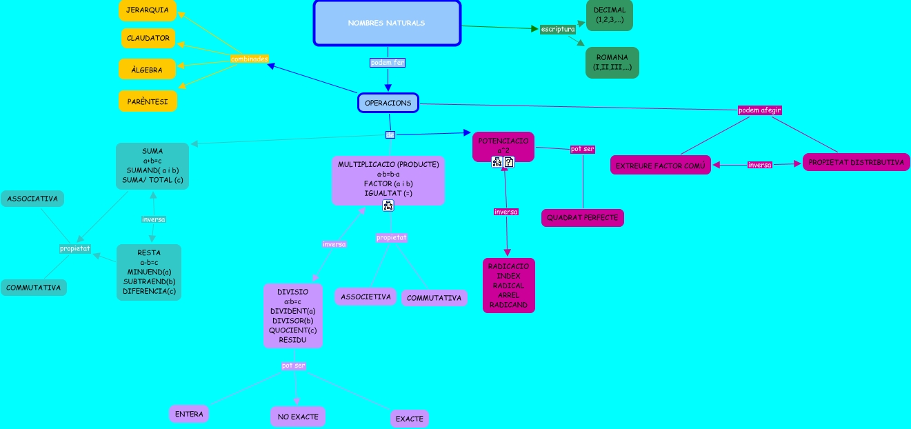 Aquest mapa conceptual conté informació relacionada amb: Nombres naturals.cmap bo, RESTA a-b=c MINUEND(a) SUBTRAEND(b) DIFERENCIA(c) propietat ASSOCIATIVA, DIVISIO a:b=c DIVIDENT(a) DIVISOR(b) QUOCIENT(c) RESIDU pot ser ENTERA, OPERACIONS combinades CLAUDATOR, OPERACIONS de POTENCIACIO a^2, SUMA a+b=c SUMAND( a i b) SUMA/ TOTAL (c) propietat COMMUTATIVA, RESTA a-b=c MINUEND(a) SUBTRAEND(b) DIFERENCIA(c) propietat COMMUTATIVA, OPERACIONS combinades PARÈNTESI, NOMBRES NATURALS podem fer OPERACIONS, OPERACIONS podem afegir EXTREURE FACTOR COMÚ, DIVISIO a:b=c DIVIDENT(a) DIVISOR(b) QUOCIENT(c) RESIDU pot ser NO EXACTE, MULTIPLICACIO (PRODUCTE) a·b=b·a FACTOR (a i b) IGUALTAT (=) propietat COMMUTATIVA, DIVISIO a:b=c DIVIDENT(a) DIVISOR(b) QUOCIENT(c) RESIDU pot ser EXACTE, OPERACIONS de SUMA a+b=c SUMAND( a i b) SUMA/ TOTAL (c), OPERACIONS de MULTIPLICACIO (PRODUCTE) a·b=b·a FACTOR (a i b) IGUALTAT (=), OPERACIONS combinades JERARQUIA, MULTIPLICACIO (PRODUCTE) a·b=b·a FACTOR (a i b) IGUALTAT (=) propietat ASSOCIETIVA, OPERACIONS combinades ÀLGEBRA, POTENCIACIO a^2 pot ser QUADRAT PERFECTE, NOMBRES NATURALS escriptura ROMANA (I,II,III,...), OPERACIONS podem afegir PROPIETAT DISTRIBUTIVA