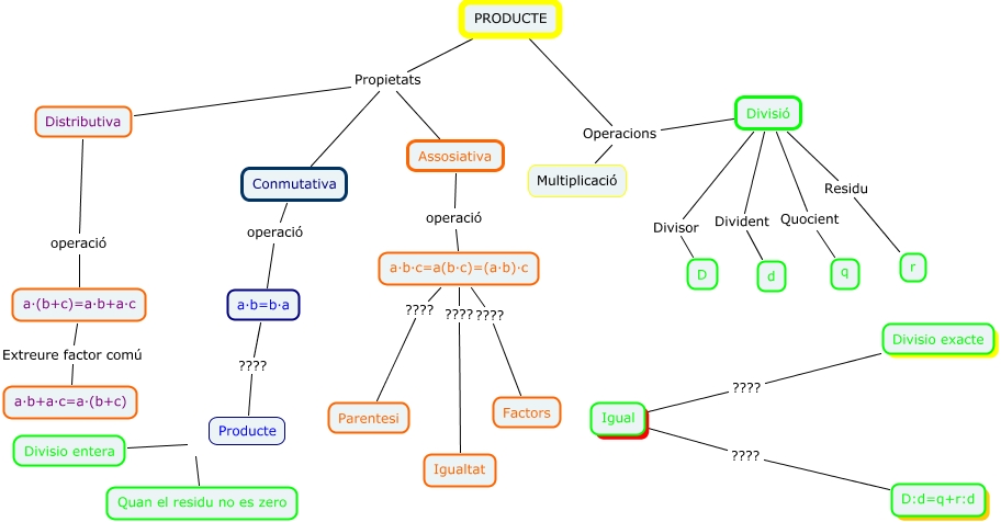 Aquest mapa conceptual conté informació relacionada amb: Propietats.cmap, Divisio entera Quan el residu no es zero, D:d=q+r:d ???? Igual, a·b·c=a(b·c)=(a·b)·c ???? Parentesi, PRODUCTE Operacions Multiplicació, a·b·c=a(b·c)=(a·b)·c ???? Igualtat, PRODUCTE Propietats Assosiativa, Divisió Divident d, Divisio exacte ???? Igual, Divisió Quocient q, a·b=b·a ???? Producte, Conmutativa operació a·b=b·a, PRODUCTE Operacions Divisió, a·b·c=a(b·c)=(a·b)·c ???? Factors, Divisió Divisor D, PRODUCTE Propietats Distributiva, PRODUCTE Propietats Conmutativa, Distributiva operació a·(b+c)=a·b+a·c, a·(b+c)=a·b+a·c Extreure factor comú a·b+a·c=a·(b+c), a·b·c=a(b·c)=(a·b)·c operació Assosiativa, Divisió Residu r