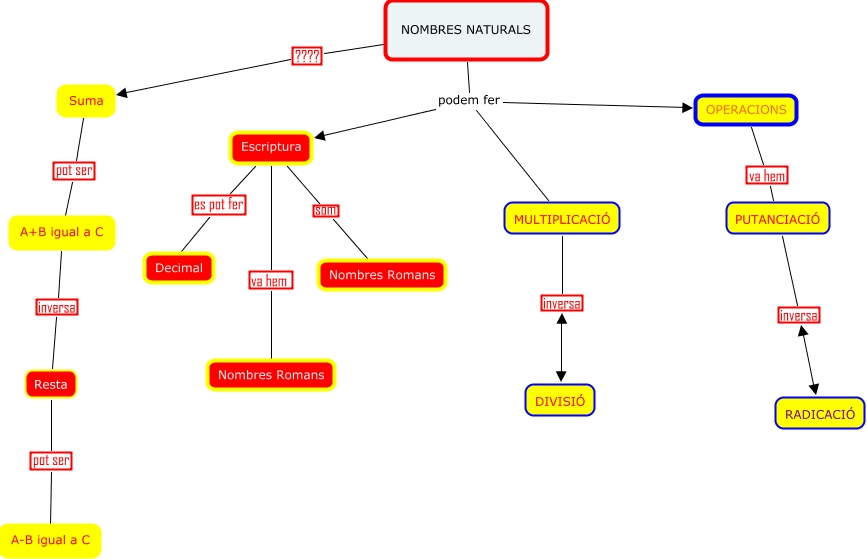 Aquest mapa conceptual conté informació relacionada amb: Nombres naturals.cmap, MULTIPLICACIÓ inversa DIVISIÓ, PUTANCIACIÓ inversa RADICACIÓ, OPERACIONS va hem PUTANCIACIÓ, NOMBRES NATURALS podem fer Escriptura, Escriptura va hem Nombres Romans, NOMBRES NATURALS podem fer MULTIPLICACIÓ, Escriptura som Nombres Romans, NOMBRES NATURALS ???? Suma, Suma pot ser A+B igual a C, NOMBRES NATURALS podem fer OPERACIONS, Escriptura es pot fer Decimal, A+B igual a C inversa Resta, Resta pot ser A-B igual a C