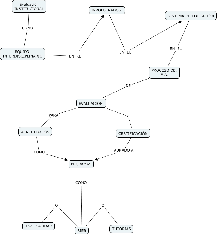 Este Cmap, tiene información relacionada con: EVALUACIÓN EN EDUC. SUPERIOR, EVALUACIÓN Y CERTIFICACIÓN, RIEB O TUTORIAS, SISTEMA DE EDUCACIÓN EN EL PROCESO DE: E-A., Evaluación INSTITUCIONAL COMO EQUIPO INTERDISCIPLINARIO, CERTIFICACIÓN AUNADO A PRGRAMAS, EQUIPO INTERDISCIPLINARIO ENTRE INVOLUCRADOS, ACREDITACIÓN COMO PRGRAMAS, PRGRAMAS COMO RIEB, INVOLUCRADOS EN EL SISTEMA DE EDUCACIÓN, EVALUACIÓN PARA ACREDITACIÓN, RIEB O ESC. CALIDAD, PROCESO DE: E-A. DE EVALUACIÓN