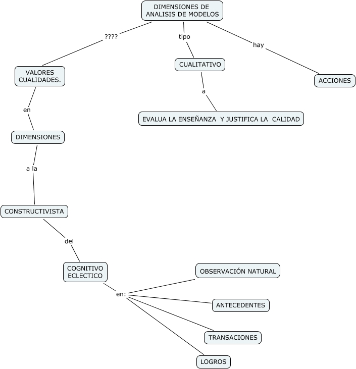 Este Cmap, tiene información relacionada con: la evaluación cualitativa del curriculo, DIMENSIONES DE ANALISIS DE MODELOS hay ACCIONES, COGNITIVO ECLECTICO en: LOGROS, CONSTRUCTIVISTA del COGNITIVO ECLECTICO, DIMENSIONES DE ANALISIS DE MODELOS tipo CUALITATIVO, COGNITIVO ECLECTICO en: TRANSACIONES, COGNITIVO ECLECTICO en: ANTECEDENTES, VALORES CUALIDADES. en DIMENSIONES, COGNITIVO ECLECTICO en: OBSERVACIÓN NATURAL, EVALUA LA ENSEÑANZA Y JUSTIFICA LA CALIDAD a CUALITATIVO, DIMENSIONES a la CONSTRUCTIVISTA, DIMENSIONES DE ANALISIS DE MODELOS ???? VALORES CUALIDADES.