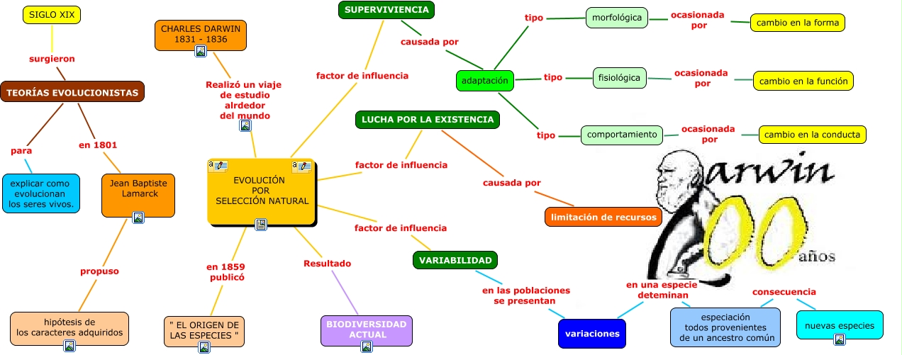 Este Cmap, tiene información relacionada con: CmapEVOLUCION, adaptación tipo comportamiento, TEORÍAS EVOLUCIONISTAS para explicar como evolucionan los seres vivos., especiación todos provenientes de un ancestro común consecuencia nuevas especies, VARIABILIDAD en las poblaciones se presentan variaciones, EVOLUCIÓN POR SELECCIÓN NATURAL en 1859 publicó " EL ORIGEN DE LAS ESPECIES ", comportamiento ocasionada por cambio en la conducta, EVOLUCIÓN POR SELECCIÓN NATURAL Resultado BIODIVERSIDAD ACTUAL, fisiológica ocasionada por cambio en la función, SUPERVIVIENCIA causada por adaptación, EVOLUCIÓN POR SELECCIÓN NATURAL factor de influencia SUPERVIVIENCIA, adaptación tipo morfológica, adaptación tipo fisiológica, SIGLO XIX surgieron TEORÍAS EVOLUCIONISTAS, EVOLUCIÓN POR SELECCIÓN NATURAL Realizó un viaje de estudio alrdedor del mundo CHARLES DARWIN 1831 - 1836, morfológica ocasionada por cambio en la forma, EVOLUCIÓN POR SELECCIÓN NATURAL factor de influencia VARIABILIDAD, variaciones en una especie deteminan especiación todos provenientes de un ancestro común, Jean Baptiste Lamarck propuso hipótesis de los caracteres adquiridos, LUCHA POR LA EXISTENCIA causada por limitación de recursos, TEORÍAS EVOLUCIONISTAS en 1801 Jean Baptiste Lamarck