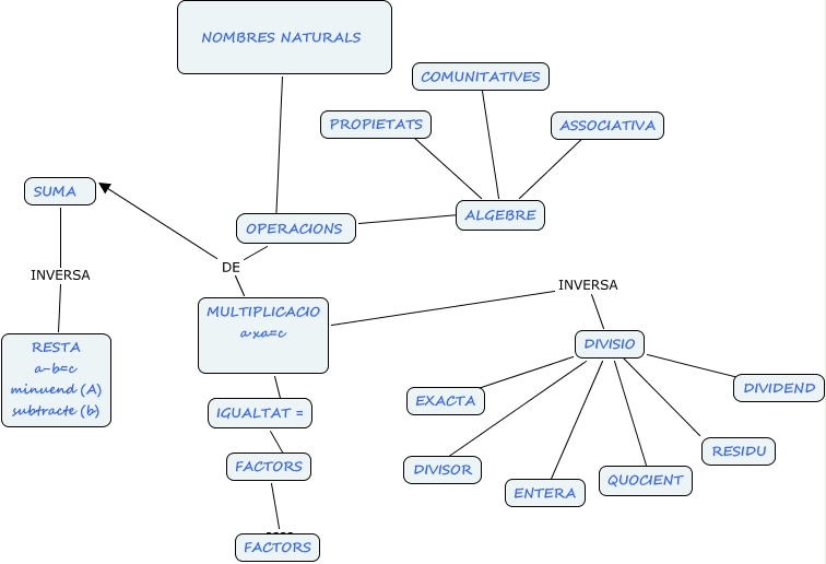 Aquest mapa conceptual conté informació relacionada amb: NOMBRES NATURALS, DIVISIO ???? EXACTA, IGUALTAT = ???? FACTORS, OPERACIONS DE SUMA, DIVISIO ???? ENTERA, OPERACIONS ???? ALGEBRE, DIVISIO ???? QUOCIENT, DIVISIO ???? RESIDU, MULTIPLICACIO a·xa=c ???? IGUALTAT =, ALGEBRE ???? COMUNITATIVES, SUMA INVERSA RESTA a-b=c minuend (A) subtracte (b), NOMBRES NATURALS ???? OPERACIONS, ALGEBRE ???? PROPIETATS, DIVISIO ???? DIVISOR, FACTORS ???? FACTORS, DIVISIO ???? DIVIDEND, ALGEBRE ???? ASSOCIATIVA, OPERACIONS DE MULTIPLICACIO a·xa=c, MULTIPLICACIO a·xa=c INVERSA DIVISIO