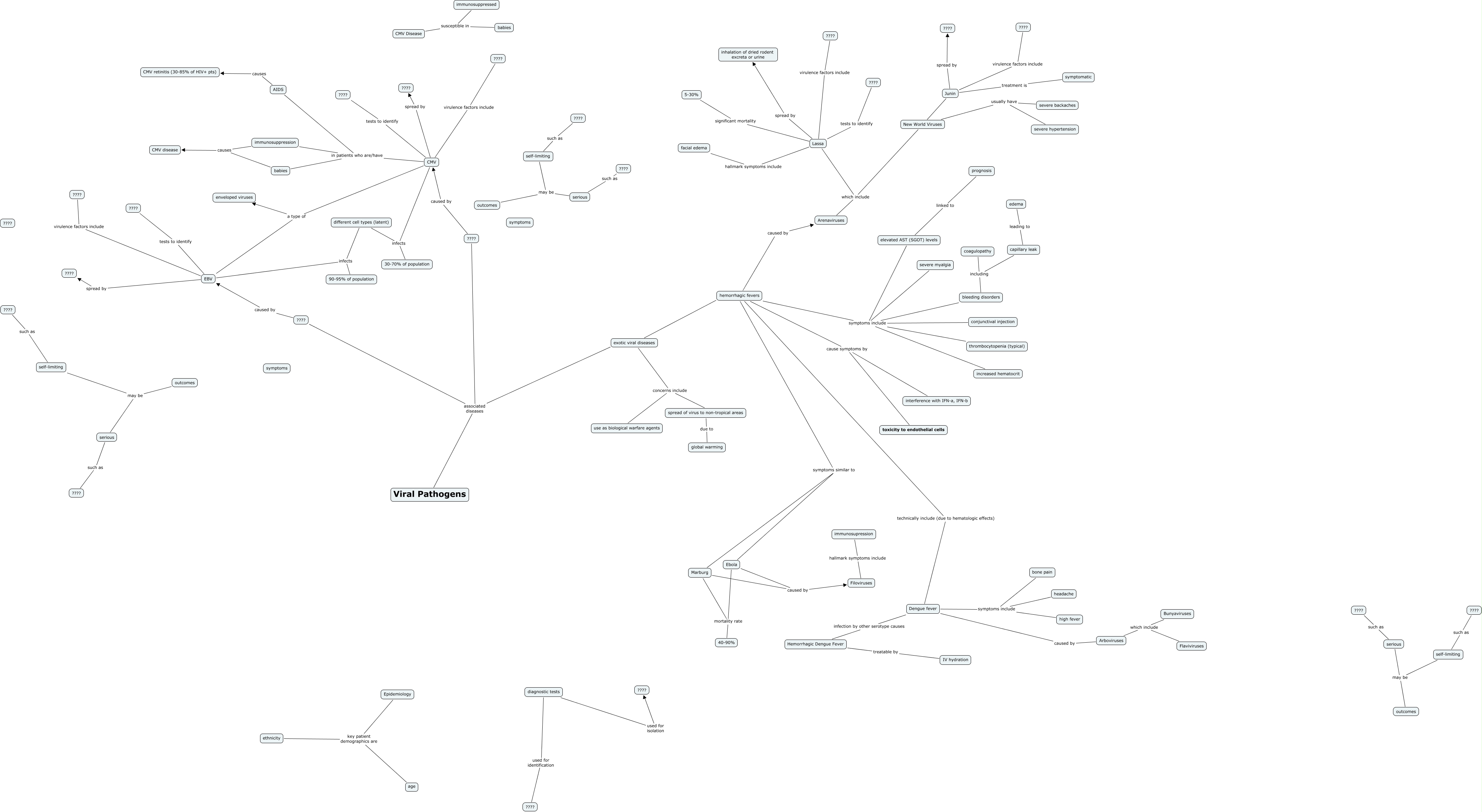 This Concept Map, created with IHMC CmapTools, has information related to: Systemic Viral Infections, immunosuppression in patients who are/have CMV, diagnostic tests used for identification ????, elevated AST (SGOT) levels linked to prognosis, Arboviruses which include Flaviviruses, serious such as ????, Dengue fever caused by Arboviruses, CMV virulence factors include ????, EBV spread by ????, Filoviruses hallmark symptoms include immunosupression, EBV a type of enveloped viruses, CMV a type of enveloped viruses, Ebola symptoms similar to hemorrhagic fevers, outcomes may be serious, Dengue fever symptoms include bone pain, Dengue fever symptoms include headache, immunosuppression causes CMV disease, Viral Pathogens associated diseases ????, EBV virulence factors include ????, Lassa spread by inhalation of dried rodent excreta or urine, exotic viral diseases concerns include spread of virus to non-tropical areas