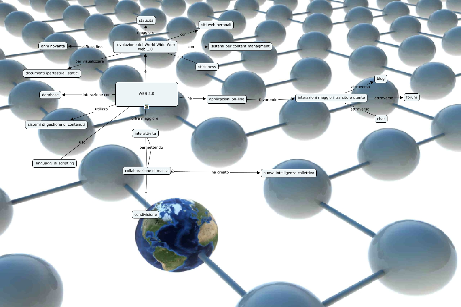 Questa Cmap, creata con IHMC CmapTools, contiene informazioni relative a: marta f, interattività permettendo condivisione, evoluzione del World Wide Web web 1.0 con stickiness, WEB 2.0 ha applicazioni on-line, evoluzione del World Wide Web web 1.0 diffuso fino anni novanta, interazioni maggiori tra sito e utente attraverso blog, WEB 2.0 è evoluzione del World Wide Web web 1.0, WEB 2.0 utilizzo sistemi di gestione di contenuti, evoluzione del World Wide Web web 1.0 con siti web peronali, collaborazione di massa ha creato nuova intelligenza collettiva, collaborazione di massa e condivisione, WEB 2.0 uso linguaggi di scripting, evoluzione del World Wide Web web 1.0 con sistemi per content managment, interazioni maggiori tra sito e utente attraverso forum, WEB 2.0 offre maggiore interattività, WEB 2.0 interazione con database, interazioni maggiori tra sito e utente attraverso chat, applicazioni on-line favorendo interazioni maggiori tra sito e utente, evoluzione del World Wide Web web 1.0 per visualizzare documenti ipertestuali statici, evoluzione del World Wide Web web 1.0 maggiore staticità, interattività ???? partecipazione