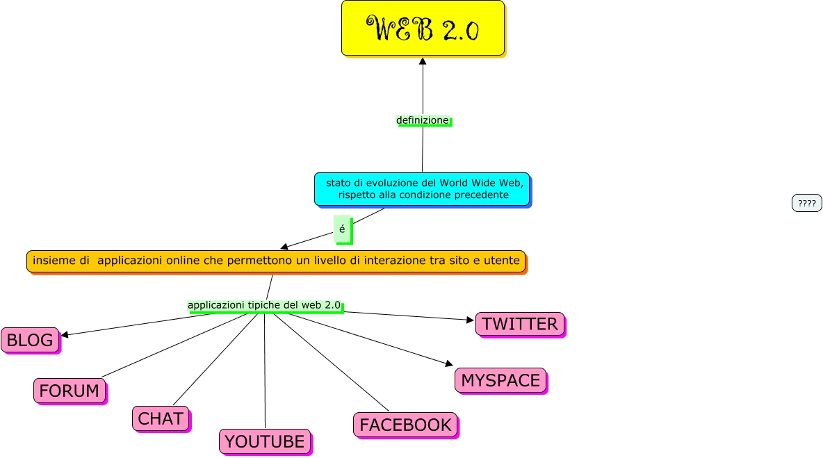 Questa Cmap, creata con IHMC CmapTools, contiene informazioni relative a: Federica Sanfilippo, stato di evoluzione del World Wide Web, rispetto alla condizione precedente é insieme di applicazioni online che permettono un livello di interazione tra sito e utente, insieme di applicazioni online che permettono un livello di interazione tra sito e utente applicazioni tipiche del web 2.0 BLOG, insieme di applicazioni online che permettono un livello di interazione tra sito e utente applicazioni tipiche del web 2.0 FORUM, insieme di applicazioni online che permettono un livello di interazione tra sito e utente applicazioni tipiche del web 2.0 FACEBOOK, insieme di applicazioni online che permettono un livello di interazione tra sito e utente applicazioni tipiche del web 2.0 CHAT, insieme di applicazioni online che permettono un livello di interazione tra sito e utente applicazioni tipiche del web 2.0 YOUTUBE, insieme di applicazioni online che permettono un livello di interazione tra sito e utente applicazioni tipiche del web 2.0 TWITTER, stato di evoluzione del World Wide Web, rispetto alla condizione precedente definizione WEB 2.0, insieme di applicazioni online che permettono un livello di interazione tra sito e utente applicazioni tipiche del web 2.0 MYSPACE