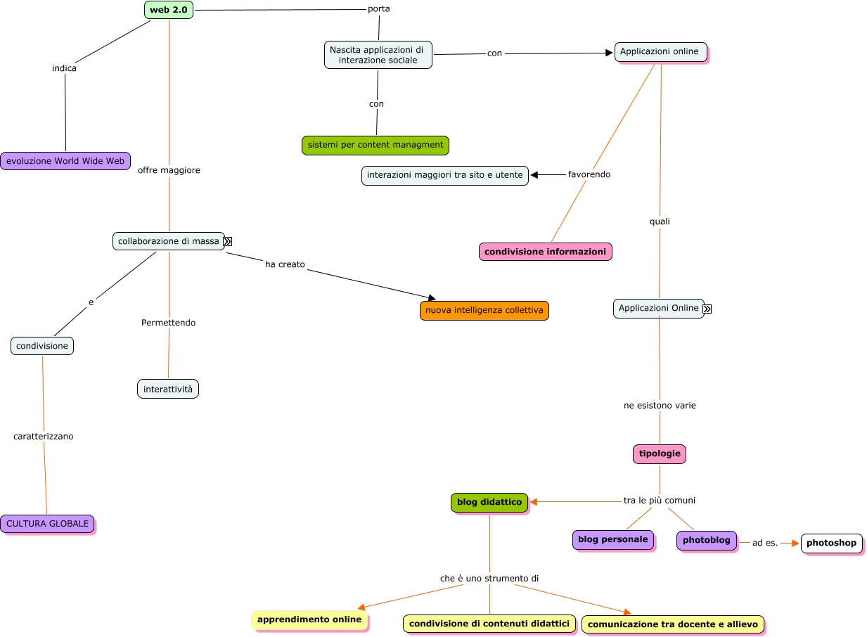 Questa Cmap, creata con IHMC CmapTools, contiene informazioni relative a: riassuntiva2, Blog ne esistono varie tipologie, collaborazione di massa Permettendo interattività, Applicazioni online favorendo condivisione informazioni, Applicazioni online quali Applicazioni Online, blog didattico che è uno strumento di condivisione di contenuti didattici, Nascita applicazioni di interazione sociale con sistemi per content managment, Nascita applicazioni di interazione sociale con Applicazioni online, collaborazione di massa e condivisione, tipologie tra le più comuni photoblog, tipologie tra le più comuni blog didattico, web 2.0 porta Nascita applicazioni di interazione sociale, blog didattico che è uno strumento di apprendimento online, collaborazione di massa ha creato nuova intelligenza collettiva, web 2.0 offre maggiore collaborazione di massa, blog didattico che è uno strumento di comunicazione tra docente e allievo, Applicazioni online favorendo interazioni maggiori tra sito e utente, web 2.0 indica evoluzione World Wide Web, condivisione caratterizzano CULTURA GLOBALE, tipologie tra le più comuni blog personale, photoblog ad es. photoshop