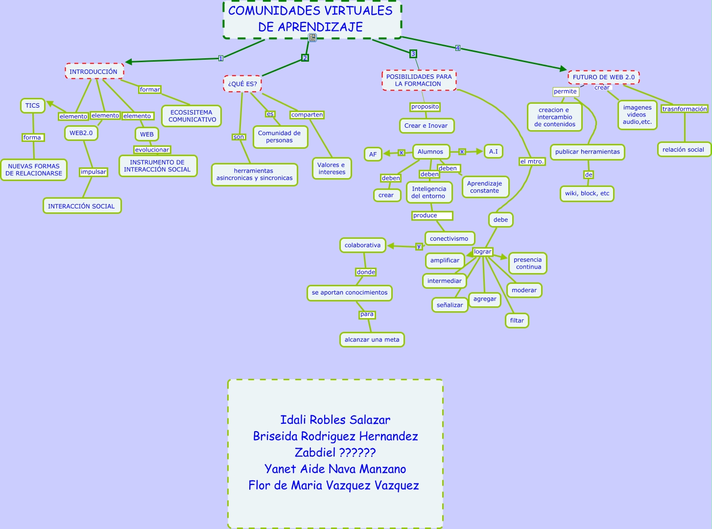 Este Cmap, tiene información relacionada con: equipo 1, Alumnos x A.I, INTRODUCCIÓN elemento WEB2.0, FUTURO DE WEB 2.0 permite creacion e intercambio de contenidos, ¿QUÉ ES? son herramientas asincronicas y sincronicas, ¿QUÉ ES? es Comunidad de personas, debe lograr señalizar, POSIBILIDADES PARA LA FORMACION el mtro. debe, Alumnos deben Inteligencia del entorno, Alumnos x AF, WEB evolucionar INSTRUMENTO DE INTERACCIÓN SOCIAL, conectivismo y colaborativa, COMUNIDADES VIRTUALES DE APRENDIZAJE 2 ¿QUÉ ES?, INTRODUCCIÓN elemento WEB, FUTURO DE WEB 2.0 trasnformación relación social, INTRODUCCIÓN formar ECOSISITEMA COMUNICATIVO, debe lograr agregar, Alumnos deben Aprendizaje constante, colaborativa donde se aportan conocimientos, se aportan conocimientos para alcanzar una meta, POSIBILIDADES PARA LA FORMACION proposito Crear e Inovar