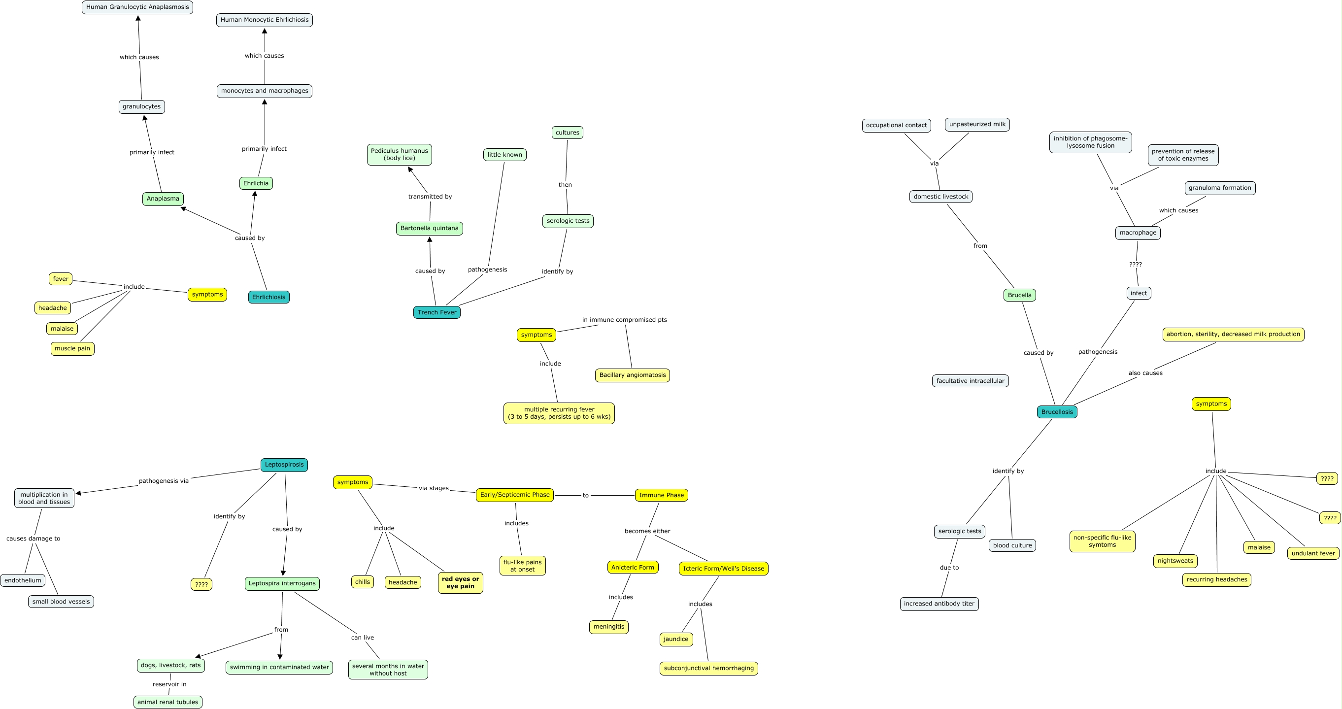 This Concept Map, created with IHMC CmapTools, has information related to: Systemic Bacterial Infections II, domestic livestock via unpasteurized milk, serologic tests then cultures, multiplication in blood and tissues causes damage to small blood vessels, Leptospira interrogans can live several months in water without host, Anicteric Form includes meningitis, Immune Phase becomes either Anicteric Form, symptoms include headache, symptoms include red eyes or eye pain, Ehrlichiosis caused by Anaplasma, Brucella from domestic livestock, Early/Septicemic Phase includes flu-like pains at onset, Icteric Form/Weil's Disease includes subconjunctival hemorrhaging, Icteric Form/Weil's Disease includes jaundice, Brucellosis identify by blood culture, infect ???? macrophage, Bartonella quintana transmitted by Pediculus humanus (body lice), Trench Fever caused by Bartonella quintana, Leptospira interrogans from swimming in contaminated water, macrophage via prevention of release of toxic enzymes, symptoms include multiple recurring fever (3 to 5 days, persists up to 6 wks)
