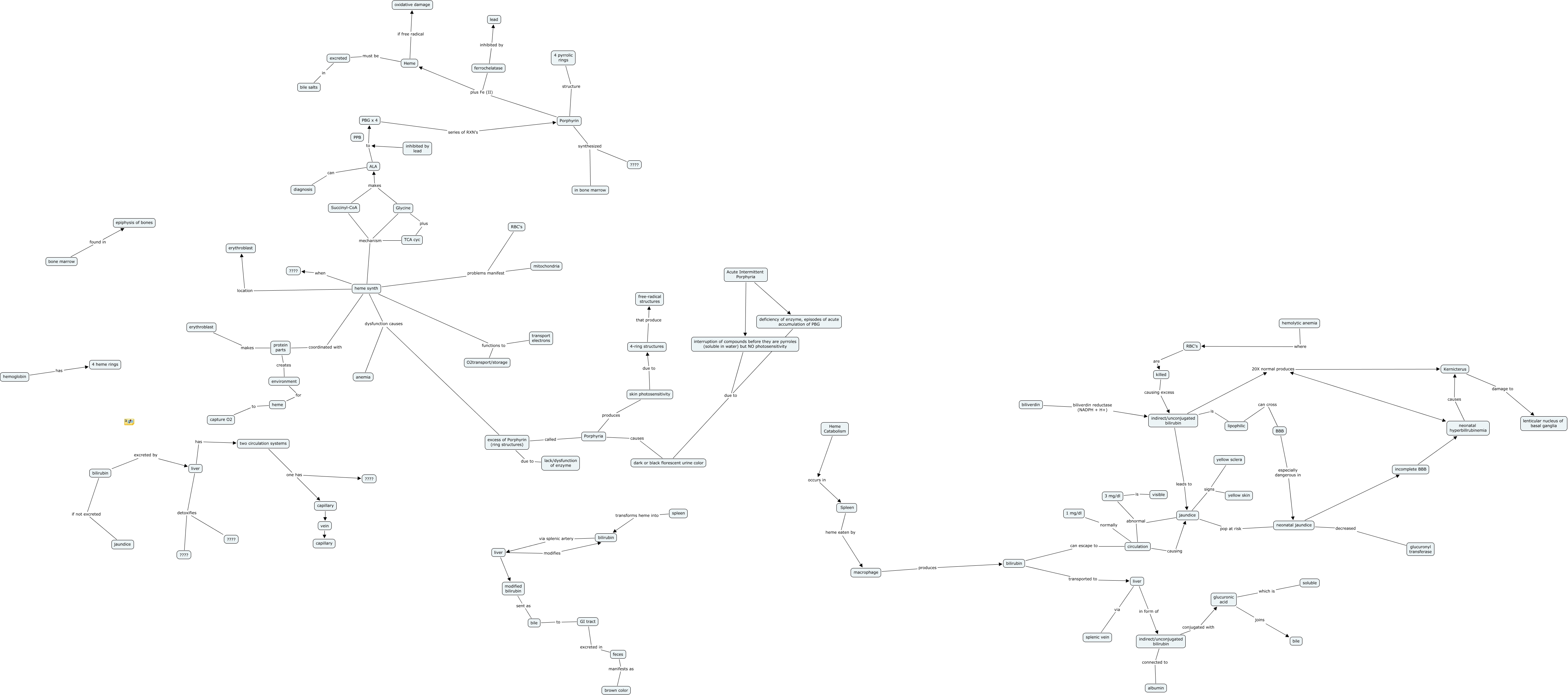 This Concept Map, created with IHMC CmapTools, has information related to: Hemoglobin Synth and Catab, Kernicterus damage to lenticular nucleus of basal ganglia, bilirubin if not excreted jaundice, Acute Intermittent Porphyria deficiency of enzyme, episodes of acute accumulation of PBG, modified bilirubin sent as bile, circulation causing jaundice, Porphyrin synthesized in bone marrow, protein parts creates environment, ALA can diagnosis, excreted in bile salts, TCA cyc plus Glycine, heme synth mechanism TCA cyc, Porphyrin synthesized ????, indirect/unconjugated bilirubin is lipophilic, dark or black florescent urine color due to interruption of compounds before they are pyrroles (soluble in water) but NO photosensitivity, jaundice signs yellow sclera, 3 mg/dl is visible, killed causing excess indirect/unconjugated bilirubin, neonatal jaundice incomplete BBB, incomplete BBB neonatal hyperbillrubinemia, Porphyria produces skin photosensitivity